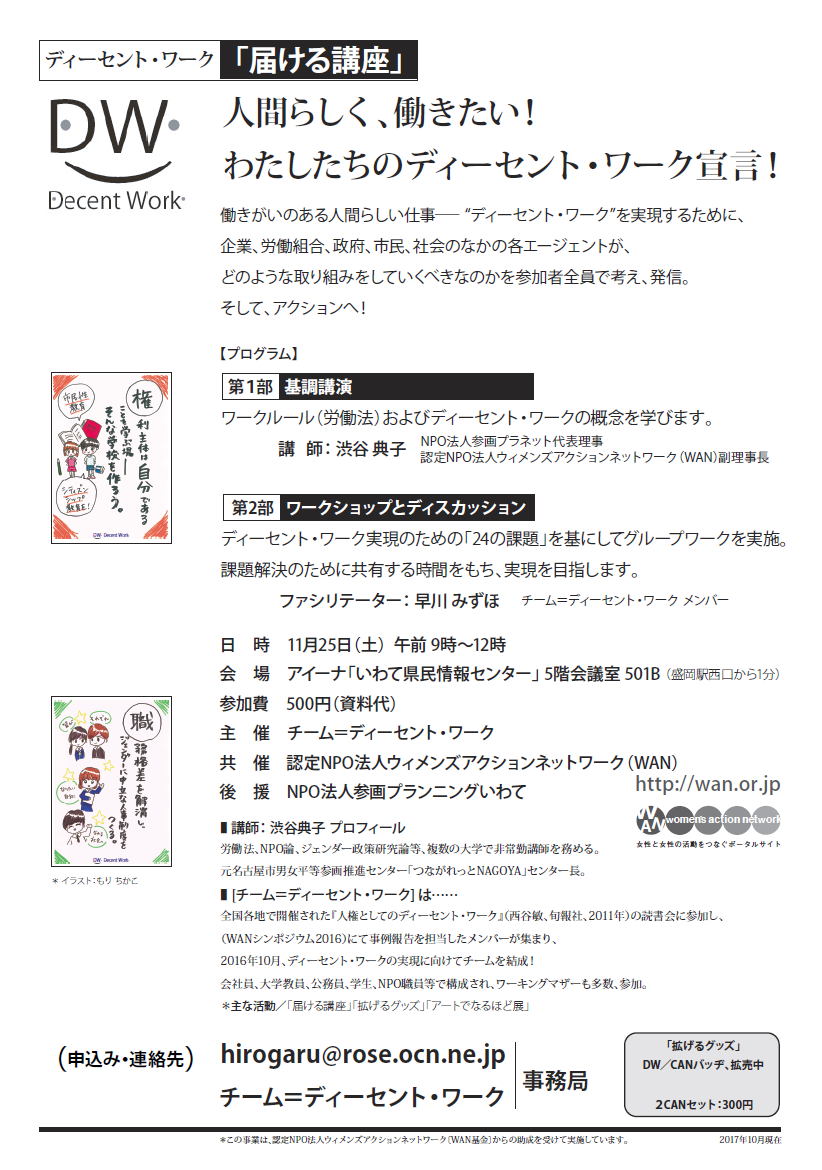 | 詳細: | 人間らしく、働きたい!わたしたちのディーセント・ワーク宣言! 働きがいのある人間らしい仕事― “ディーセント・ワーク”を実現するために、 企業、労働組合、政府、市民、社会のなかの各エージェントが、 どのような取り組みをしていくべきなのかを参加者全員で考え、発信。 そして、アクションへ! 第1部 基調講演 ワークルール(労働法)およびディーセント・ワークの概念を学びます。 講 師: 渋谷 典子 NPO法人参画プラネット代表理事 認定NPO法人ウィメンズアクションネットワーク(WAN)副理事長 第2部 ワークショップとディスカッション ディーセント・ワーク実現のための「24の課題」を基にしてグループワークを実施。 課題解決のために共有する時間をもち、実現を目指します。 ファシリテーター: 早川 みずほ チーム=ディーセント・ワーク メンバー 日 時 11月25日(土) 午前 9時~12時 会 場 アイーナ「いわて県民情報センター」 5階会議室 501B( 盛岡駅西口から1分) 参加費 500円(資料代) 主 催 チーム=ディーセント・ワーク 共 催 認定NPO法人ウィメンズアクションネットワーク(WAN) 後 援 NPO法人参画プランニングいわて 連絡先 チーム=ディーセント・ワーク事務局 hirogaru(あっと)rose.ocn.ne.jp *この事業は、認定NPO法人ウィメンズアクションネットワーク〔WAN基金〕からの助成を受けて実施しています。 |