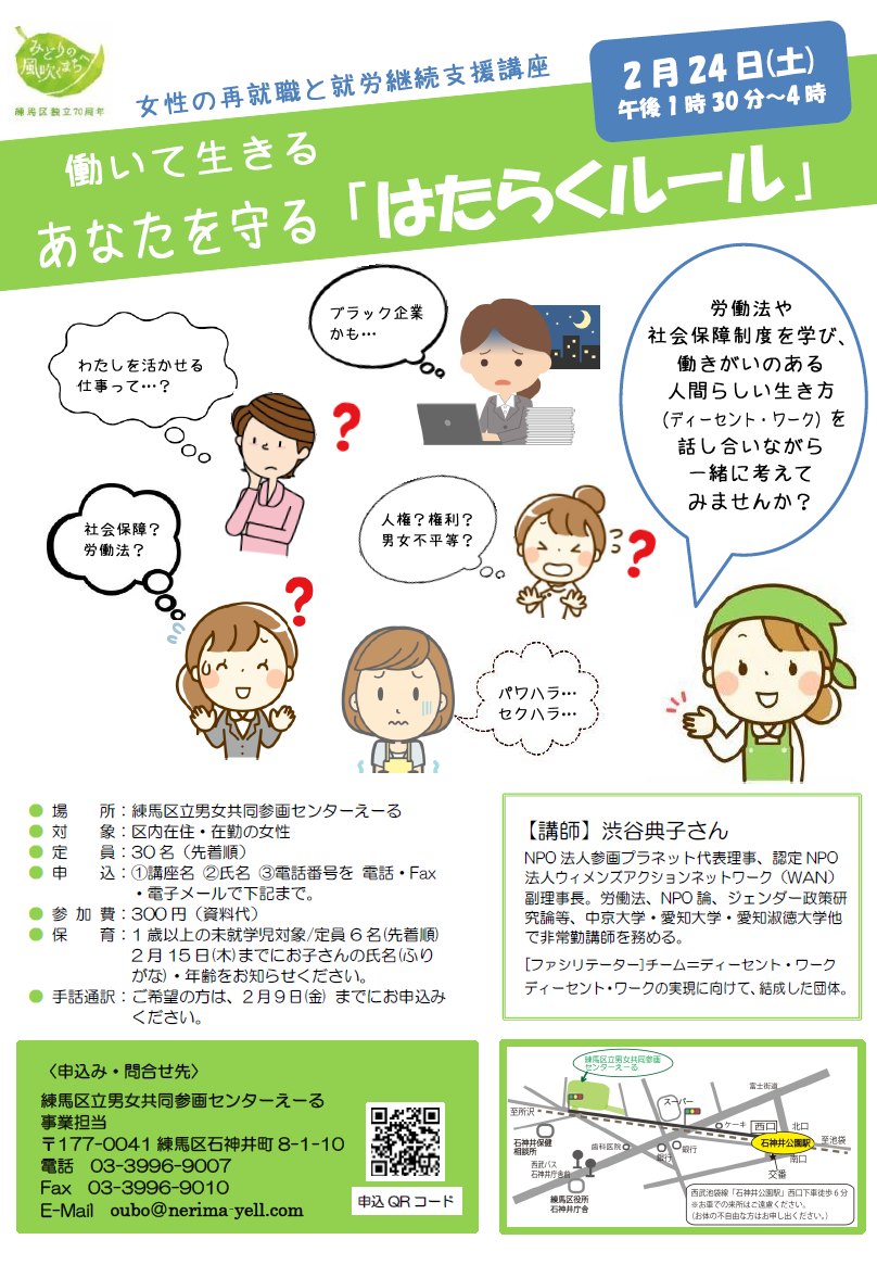 | 詳細: | 働いて生きる あなたを守る「はたらくルール」 日 時 2月24日(土) 午後1時30分~4時 会 場 練馬区男女共同参画センター えーる 参加費 300円 主 催 練馬区男女共同参画センター えーる ■ 講師: 渋谷典子 プロフィール 労働法、NPO論、ジェンダー政策研究論等、複数の大学で非常勤講師を務める。 元名古屋市男女平等参画推進センター「つながれっとNAGOYA」センター長。 ■ ファシリテーター:早川 瑞(チーム=ディーセント・ワーク メンバー) ■ [チーム=ディーセント・ワーク] は…… 全国各地で開催された『人権としてのディーセント・ワーク』(西谷敏、旬報社、2011年)の読書会に参加し、 (WANシンポジウム2016)にて事例報告を担当したメンバーが集まり、 2016年10月、ディーセント・ワークの実現に向けてチームを結成! 会社員、大学教員、公務員、学生、NPO職員等で構成され、ワーキングマザーも多数、参加。 *主な活動/「届ける講座」「拡げるグッズ」「アートでなるほど展」 申込み・連絡先:練馬区男女共同参画センター えーる 03-3396-9007 |