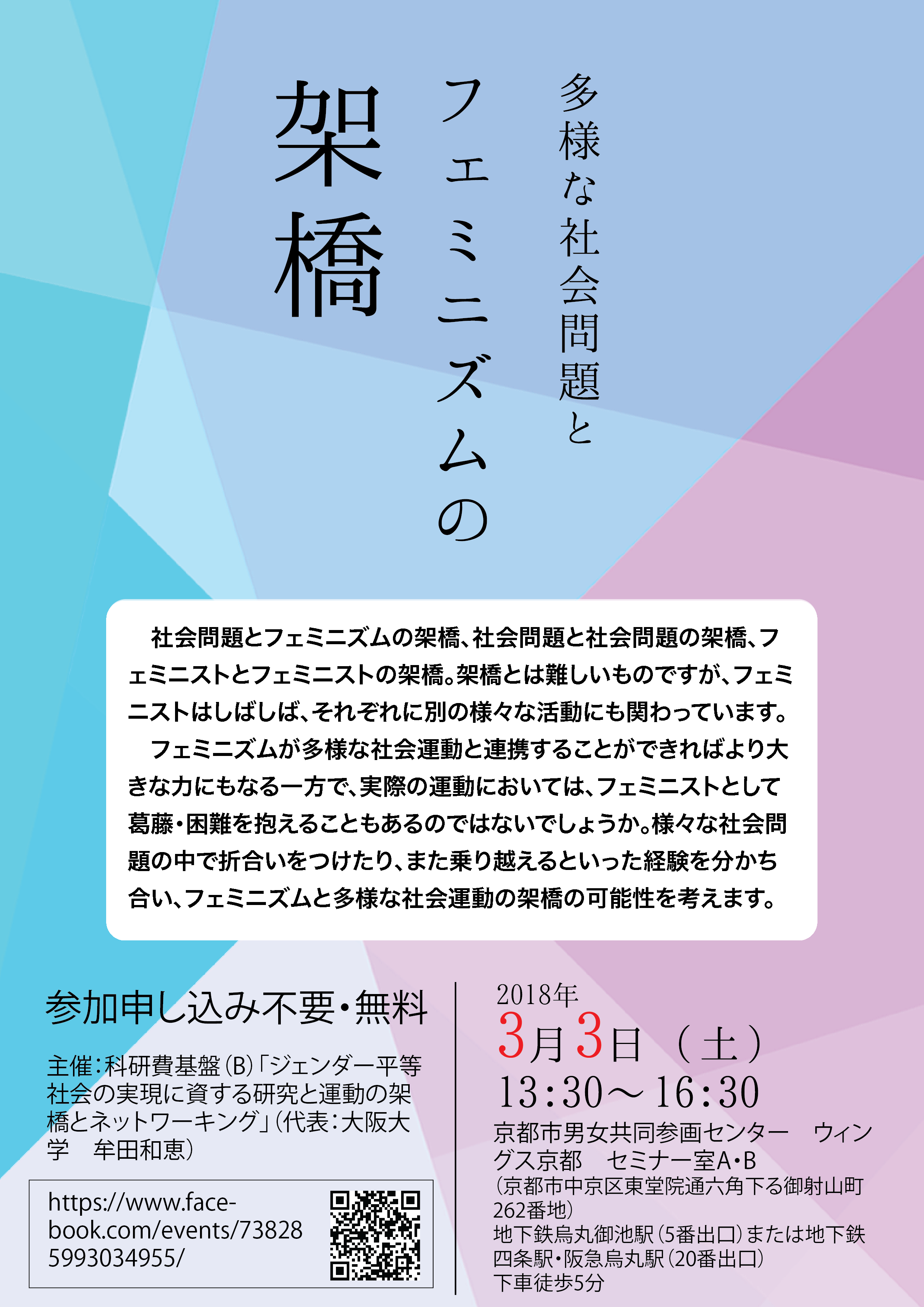 | 詳細: | 多様な社会問題とフェミニズムの架橋2018 日時:2018年3月3日(土) 13:30 - 16:30 会場:ウィングス京都 京都市男女共同参画センター 入場:無料 ◆架橋って、そんなに簡単ではない…けど。 多元的アイデンティティの中で、一人のフェミニストが多様な運動にかかわることも多い フェミニズムが多様な社会運動と連携することができれば、大きな力にもなるだろうけれど、 実際の運動においては、フェミニストとして葛藤・困難を抱えることもあるのでは? みんなどうやって折合いをつける/乗り越えているんだろう? その経験を分かち合い、フェミニズムと多様な社会運動の架橋の可能性を考えたい。 ◆パネリスト: ・金明和さん(朝鮮学校美術講師、土偶、イラスト制作者) ・梁永山聡子さん(大学非常勤講師、アジア女性資料センター、ゆるふぇみカフェ運営委員) ・堀あきこさん(大学非常勤講師、シェアハウス運営) ◆司会:古久保さくら(大阪市立大学人権問題研究センター准教授) ※当イベントでは、保育、情報保障(PC通訳、手話)がございません。ご不便をおかけいたしますが、ご了承ください。 ◆主催:科研費基盤(B)「ジェンダー平等社会の実現に資する研究と運動の架橋とネットワーキング」(代表:大阪大学 牟田和恵) |