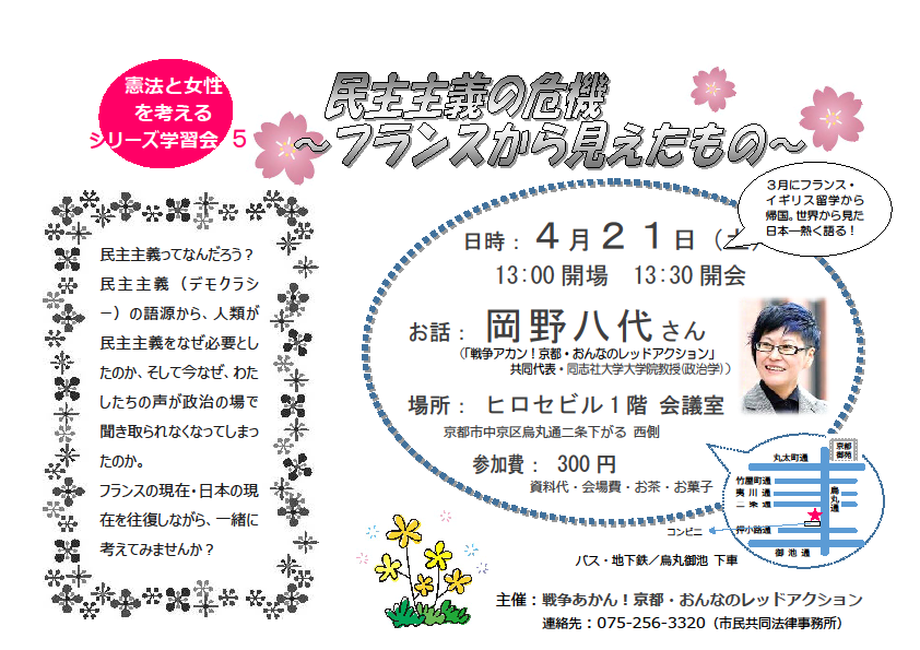 | 詳細: | 憲法と女性を考える シリーズ学習会 5 「民主主義の危機--フランスから見えたもの--」 民主主義ってなんだろう? 民主主義(デモクラシー)の語源から、人類が民主主義をなぜ必要としたのか、そして今なぜ、わたしたちの声が政治の場で聞き取られなくなってしまったのか。 フランスの現在・日本の現在を往復しながら、一緒に考えてみませんか? 日時:4月21日(土) 13:00開場 13:30開会 お話: 岡野八代さん (「戦争アカン!京都・おんなのレッドアクション」 共同代表・同志社大学大学院教授(政治学)) 場所: ヒロセビル1階 会議室 京都市中京区烏丸通二条下がる 西側 参加費: 300円 資料代・会場費・お茶・お菓子 主催:戦争あかん!京都・おんなのレッドアクション 連絡先:075-256-3320(市民共同法律事務所) |