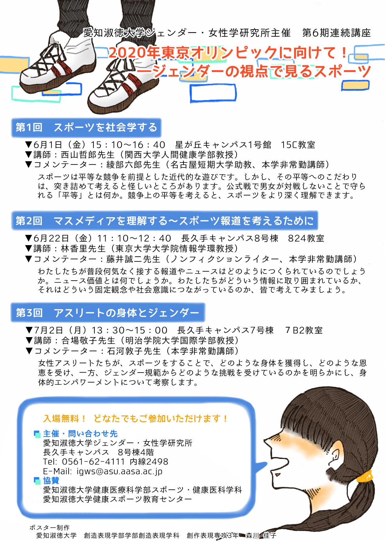 | 詳細: | 愛知淑徳大学ジェンダー・女性学研究所主催 第6期連続講座 ===================== 2020年東京オリンピックに向けて! -ジェンダーの視点で見るスポーツ ===================== スポーツと、スポーツをめぐる社会のありようをジェンダーの視点で捉え、 考える講座です。ご関心のある回のみの参加も可能です。 是非、この機会にスポーツを見る視野を広げてみませんか? ◆第1回 スポーツを社会学する 日時・会場:6月1日(金)15:10~16:40 星が丘キャンパス1号館 15C教室 講師:西山哲郎先生(関西大学人間健康学部教授) コメンテーター:綾部六郎先生(名古屋短期大学助教、本学非常勤講師) 概要:スポーツは平等な競争を前提とした近代的な遊びです。しかし、その平等へのこだわりは、突き詰めて考えると怪しいところがあります。公式戦で男女が対戦しないことで守られる「平等」とは何か。競争上の平等を考えると、スポーツをより深く理解できます。 ◆第2回 マスメディアを理解する~スポーツ報道を考えるために 日時・会場:6月22日(金)11:10~12:40 長久手キャンパス8号棟 824教室 講師:林香里先生(東京大学大学院情報学環教授) コメンテーター:藤井誠二先生(ノンフィクションライター、本学非常勤講師) 概要:わたしたちが普段何気なく接する報道やニュースはどのようにつくられているのでしょうか。ニュース価値とは何でしょうか。わたしたちがどういう情報に取り囲まれているか、それはどういう固定観念や社会意識につながっているのか、皆で考えてみましょう。 ◆第3回 アスリートの身体とジェンダー ●日時・会場:7月2日(月)13:30~15:00 長久手キャンパス7号棟 7B2教室 ●講師:合場敬子先生(明治学院大学国際学部教授) <講師プロフィール> 1997年ワシントン州立大学社会学部大学院において社会学博士号取得。現在、明治学院大学国際学部教授。著書に『女子プロレスラーの身体とジェンダー─規範的「女らしさ」を超えて』(2013年、明石書店)『Transformed Bodies and Gender: Experiences of Women Pro Wrestlers in Japan』(2017年、Union Press)。 ●コメンテーター:石河敦子先生(本学非常勤講師) ●概要:女性アスリートたちが、スポーツをすることで、どのような身体を獲得し、どのような恩恵を受け、一方、ジェンダー規範からどのような挑戦を受けているのかを明らかにし、身体的エンパワーメントについて考察します。 ※事前申し込み不要、参加費無料。どなたでもご参加いただけます。 ※恐れ入りますが、いずれも会場も公共交通機関をご利用の上お越しくだされば幸いです。 (交通アクセス http://www.aasa.ac.jp/guidance/campus_guide/map.html) ◆主催・問い合わせ先 愛知淑徳大学ジェンダー・女性学研究所 長久手キャンパス 8号棟4階 Tel: 0561-62-4111 内線2498 E-Mail: igws@asu.aasa.ac.jp ◆協賛 愛知淑徳大学健康医療科学部スポーツ・健康医科学科 愛知淑徳大学健康スポーツ教育センター |