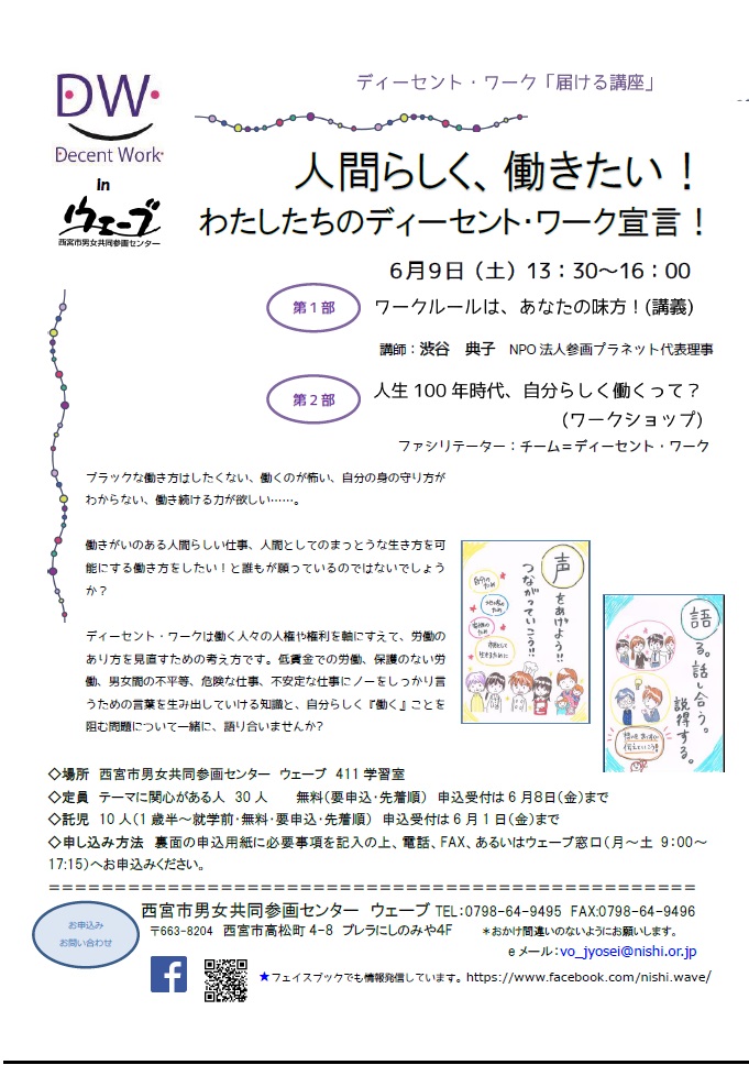 | 詳細: | 人間らしく、働きたい!わたしたちのディーセント・ワーク宣言~ディーセント・ワーク「届ける講座」 第一部 基調講演 ワークルールとディーセント・ワークの概念を学ぶ。 第二部 ワークショップとディスカッション 開催日程:6月9日(土)13:30~16:00 講師:渋谷典子(NPO法人 参画プラネット代表理事)、チーム=ディーセントワーク 定員:30人 無料 対象:テーマに関心がある人 会場:男女共同参画センター ウェーブ411学習室 保育:有 10人(6/1金)までに申し込み要) <概要> 働きがいのある人間らしい仕事(ディーセント・ワーク)を実現するために、どのような取り組みをしていけばいいのか参加者全員で考え発信します。 |
