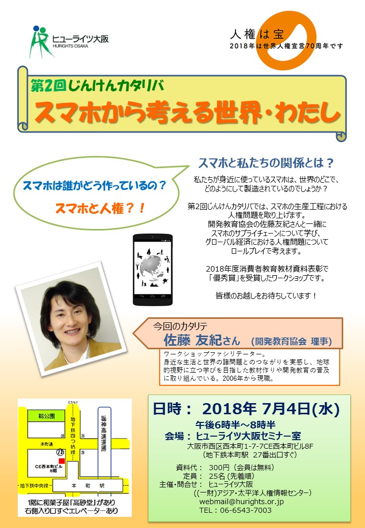 | 詳細: | 「スマホは誰がどう作っているの?」 「スマホと人権?!」 スマホと私たちの関係とは? 私たちが身近に使っているスマホは、世界のどこで、どのようにして製造されているのでしょうか? 第2回じんけんカタリバでは、スマホの生産工程における人権問題を取り上げます。 開発教育協会の佐藤友紀さんと一緒にスマホのサプライチェーンについて学び、 グローバル経済における人権問題についてロールプレイで考えます。 2018年度消費者教育教材資料表彰で「優秀賞」を受賞したワークショップです。 皆様のお越しをお待ちしています! 今回のカタリテ:佐藤 友紀さん(開発教育協会 理事) ワークショップファシリテーター。身近な生活と世界の諸問題とのつながりを実感し、 地球的視野に立つ学びを目指した教材作りや開発教育の普及に取り組んでいる。2006年から現職。 資料代:300円(会員は無料) 定員:25名 (先着順) |