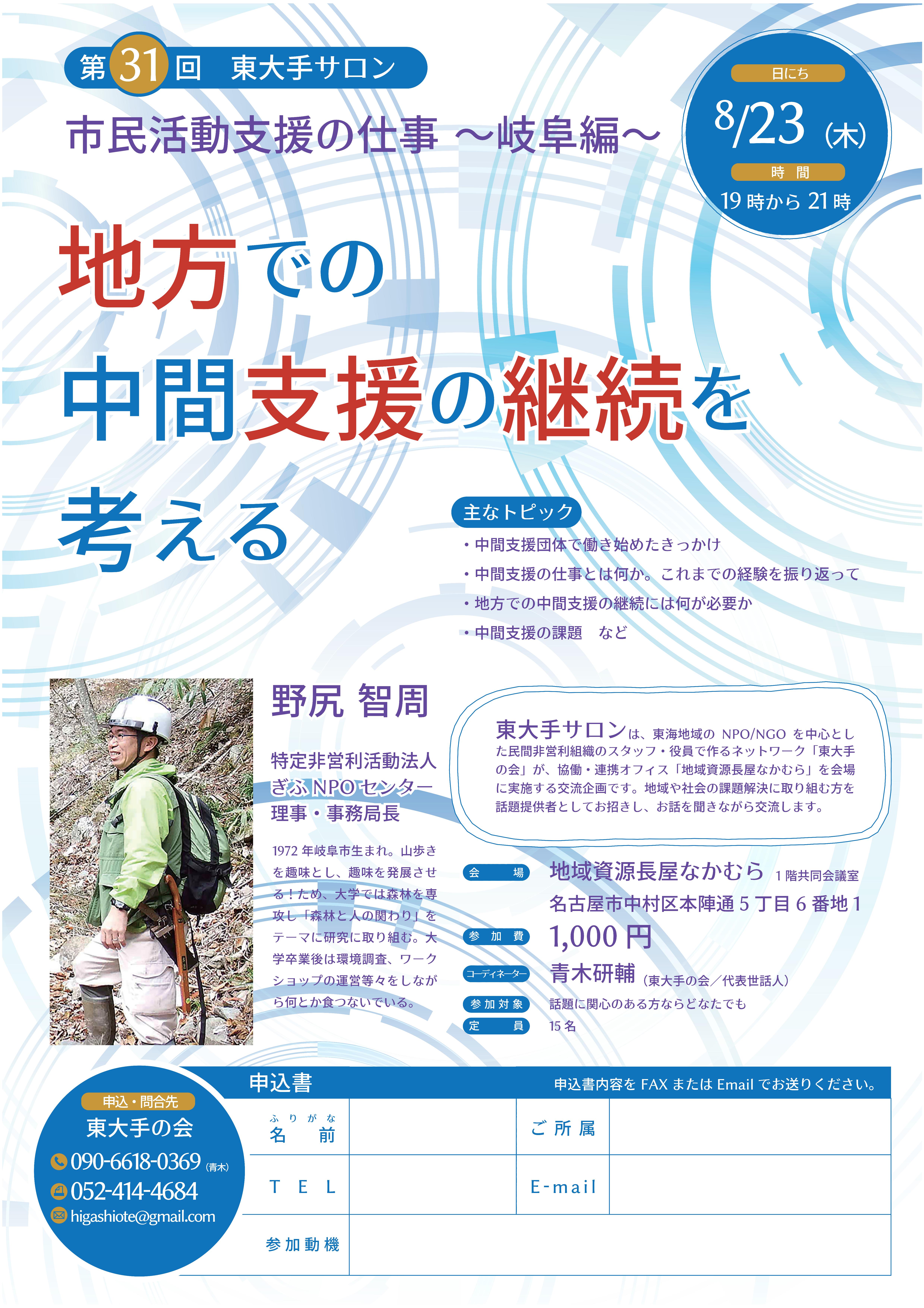 | 詳細: | ■東大手サロン【第31回】 開催のご案内 ○東大手サロンとは 東大手サロンは、東海地域のNPO/NGOを中心とした民間非営利組織のスタッフ・役員で作るネットワーク「東大手の会」が、協働・連携オフィス「地域資源長屋なかむら」を会場に実施する交流企画です。地域や社会の課題解決に取り組む方を話題提供者としてお招きし、お話を聞きながら交流します。 【日 時】2018年8月23日(木)19時00分~21時00分 【会 場】地域資源長屋なかむら・共同会議室(名古屋市中村区本陣通5丁目6番地1) 【定 員】15名 【参加費】1,000円 【参加対象】話題に関心のある方ならどなたでも 【話 題】市民活動支援の仕事 ~岐阜編~「地方での中間支援の継続を考える」 【話題提供】 野尻 智周さん(特定非営利活動法人ぎふNPOセンター理事・事務局長) 1972年岐阜市生まれ。山歩きを趣味とし、趣味を発展させる!ため、大学では森林を専攻し「森林と人の関わり」をテーマに研究に取り組む。大学卒業後は環境調査、ワークショップの運営等々をしながら何とか食つないでいる。 【主なトピック】 ・中間支援団体で働き始めたきっかけ ・中間支援の仕事とは何か。これまでの経験を振り返って ・地方での中間支援の継続には何が必要か ・中間支援の課題 など 【聞き手】青木研輔(東大手の会・代表世話人) <申込方法> ※下記内容を、FAX または Email で連絡ください 所属団体/氏名/電話番号/Email/参加動機・ゲストへの質問 <申込先> 東大手の会 FAX 052-414-4684 Email higashiote@gmail.com 【主催】東大手の会 https://www.facebook.com/higashiote ※東海地域のNPO/NGOを中心とした民間非営利組織のスタッフ・役員で作るネットワークとして、NPO向けに研修・交流機会を提供。近年は、NPOに関する調査研究にも取り組んでいます。 ↓チラシは、こちらからダウンロードしていただけます http://blog.canpan.info/higashiote/archive/250 |
