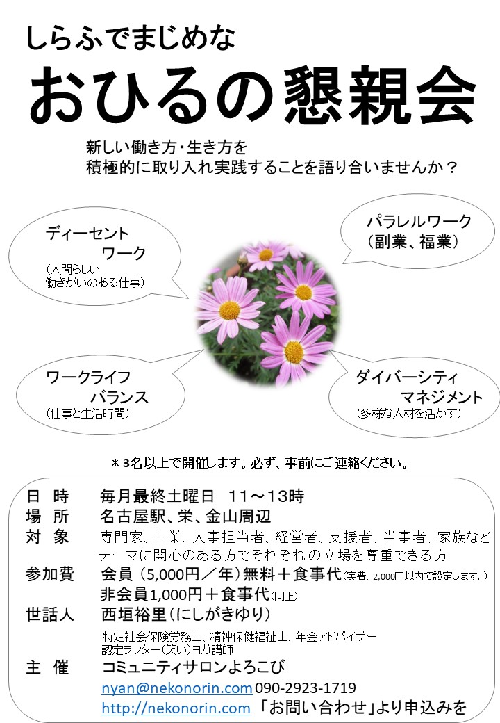 | 詳細: | *3名以上で開催します。必ず前日までに事前連絡をお願いします。 連絡のない方は、待ちませんのであしからず。 新しい働き方・生き方を積極的に取り入れ実践することを語り合いませんか? テーマ ディーセントワーク(人間らしい働きがいのある仕事) パラレルワーク(副業、福業) ダイバーシティマネジメント(多様な人材を活かす) ワークライフバランス(仕事と生活時間) など 集合 10:50 名古屋駅タワーズシャトル(12階へ上がるエレベーター)前 <対象>専門家、支援者、当事者、家族などテーマに関心のある方で それぞれの立場を尊重できる方。 士業の方、経営者の方、企業の人事担当者の方も歓迎! <参加費>会員無料(年会費5,000円)+食事代(実費、2,000円以内を設定) 非会員1,000円+食事代(同上) <世話人代表>西垣裕里(にしがきゆり) 特定社会保険労務士、精神保健福祉士、年金アドバイザー 認定ラフター(笑い)ヨガ講師 |
