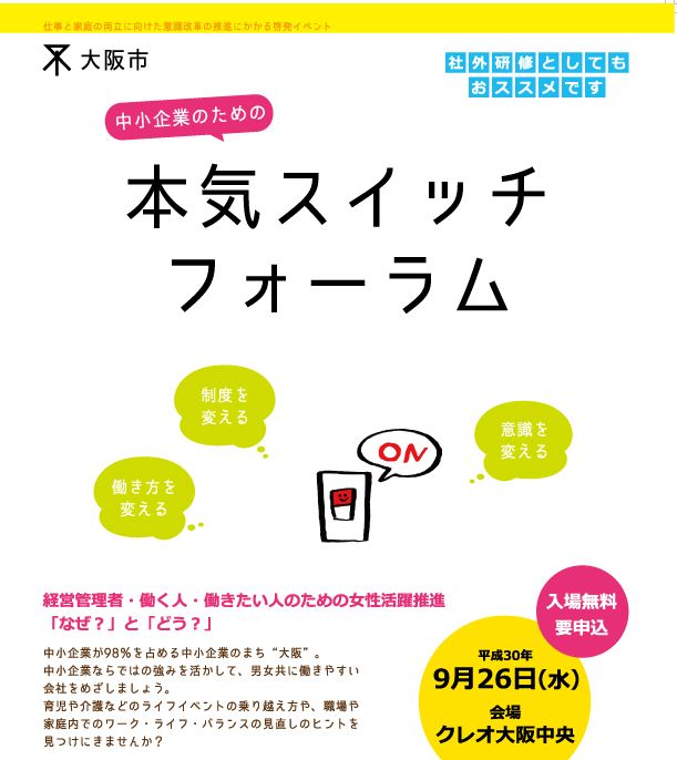 | 詳細: | 『女性活躍推進』の誤解を解く~課題によって使い分ける女性活躍推進の戦略~ 中小企業に見られがちな女性活躍の課題を、「採用」「就労継続」「配置・育成」に分けて考え、自社の課題を把握し、自社の社員にとっての「働きがいと働きやすさ」を高める取組について学びます。 講師:上田 実千代 氏(中小企業診断士・有限会社オフィスウエダ代表取締役) 対象:企業の経営管理者層 定員:40名 参加費:無料 一時保育:あり 対象:6か月~就学前(6か月~2歳800円 3歳~500円)9/19締切 手話通訳有(要申込/9/19締切) 主催:大阪市 実施団体:大阪市仕事と家庭の両立支援事業体 一般財団法人大阪市男女共同参画のまち創生協会 有限責任事業組合大阪職業教育協働機構 株式会社これから 共催:関西女性活躍推進フォーラム 大阪女性きらめき応援会議構成団体 (一般財団法人大阪市男女共同参画のまち創生協会 大阪労働局 公益社団法人関西経済連合会 大阪商工会議所 大阪市女性起業家情報交流協会 公益財団法人21世紀職業財団関西事務所 公立大学法人大阪市立大学 大阪市地域女性団体協議会 大阪市PTA協議会 特定非営利活動法人大阪NPOセンター 日本労働組合総連合会大阪府連合会) 後援:大阪府 申込み・問合せ先 大阪市男女いきいき財団(正式名称:一般財団法人大阪市男女共同参画のまち創生協会) 電話:06-7656-9040 FAX:06-7656-9045 |