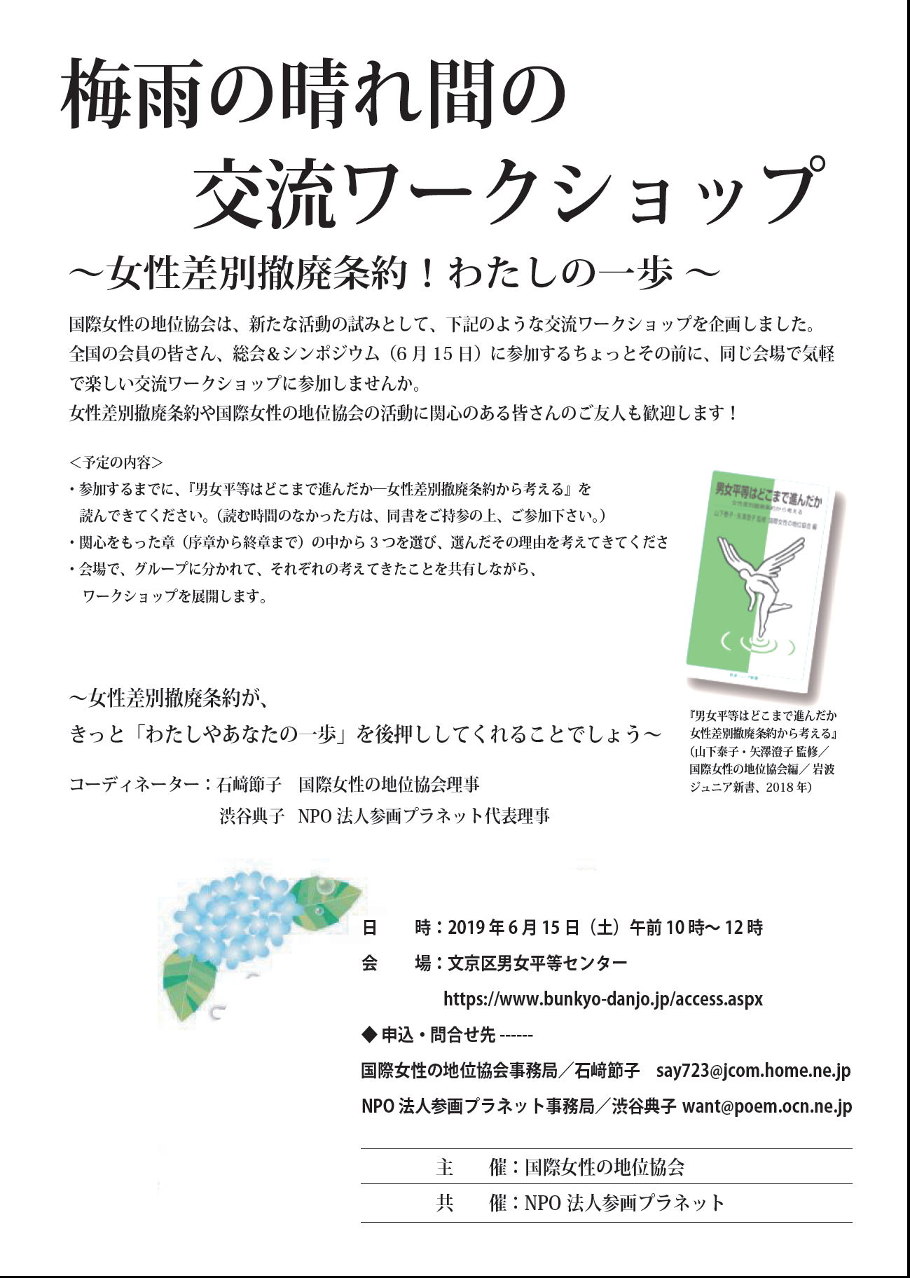 | 連絡先: | 国際女性の地位協会事務局/石崎節子 say723★jcom.home.ne.jp(★を@に変える) NPO法人参画プラネット事務局/渋谷典子 want★poem.ocn.ne.jp(★を@に変える) |