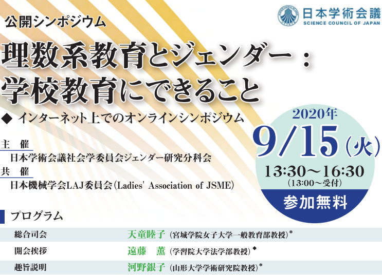 | 詳細: | 参加費無料・事前申込(申込フォームより) 申込み締め切り:9月8日(火) 開催趣旨 日本社会のジェンダー平等に向けた歩みは遅く、さまざまな領域で活躍する女性 は依然として少ない。とりわけ理系分野の専攻や職業における女性割合は低く、事態 の改善は政策的課題としても位置づけられている。以来10年以上が経過し、科学技術 人材としての女子・女性の育成を支援する諸事業が実施されてきたものの、そのほと んどが教育課程外で行われている。学校教育の外でこうした取組みが必要となってい るのはなぜなのか。学校の理数系教育において女子が十分に学べていないからなのか。 本シンポジウムでは、フェミニズムが科学教育に与えた欧米の経緯にも詳しい算数・ 数学教育と理科教育の専門家らを招き、日本の理数系教育とジェンダーに関する先 駆的研究や実践の話題提供を受けつつ、他分野の実践や研究に詳しい有識者を交えて ともに議論する。理数系教育とジェンダーに関して学校教育にできることを広く議論 し発信したい。 プログラム 総合司会 天童睦子(宮城学院女子大学一般教育部教授) 13:30 開会挨拶:遠藤薫(学習院大学法学部教授) 趣旨説明:河野銀子(山形大学学術研究院教授) 13:50 理数系教育の研究と実践 「学校での算数・数学とジェンダー」 瀬沼花子(玉川大学教育学部教授:数学教育学) 「学校理科教育におけるジェンダーの問題と課題」 稲田結美(日本体育大学児童スポーツ教育学部教授:理科教育学) 「ヤマガタ 夢☆未来Girlsプロジェクト で行いたいこと」 栗山恭直(山形大学学術研究院教授:化学・化学教育) 14:55 他分野からのコメント 山西陽子(九州大学工学研究院機械工学部門教授:流体医工学) 井谷惠子(京都教育大学教育学部名誉教授:体育科教育学) 小浜正子(日本大学文理学部教授:アジア史) 15:30 総括討論 16:25 閉会挨拶 宮崎恵子(海上技術安全研究所国際連携センター副センター長) |