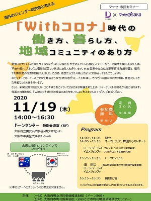 | 詳細: | ドーン財団×マッセ大阪共催セミナー 海外のジェンダー研究者と考える「With コロナ」時代の働き方、暮らし方、地域コミュニティのあり方 新型コロナウイルスとの共存を探りながら新しい働き方や生活スタイルに適応していく一方で、休業や失業による収入減、不安や疲れ、ストレスの増加など苦しい状況にある人も多くいます。外出自粛中、女性は家事や育児の負担が増え、雇用でも男女間の格差が顕在化しました。この間、他国ではコロナ禍とどのように向き合ってきたのでしょうか。本セミナーでは、オーストラリアと韓国から女性研究者がリモートで出演し、それぞれの国の状況や対策、表面化してきた問題などのお話を伺います。 さらに、新聞記者の畑律江さんが、コロナ禍で起こっていたさまざまな問題を取り上げ、ジャーナリストの視点から振り返ります。 他国の対策を知り、「Withコロナ」時代の社会のあり方をいっしょに考えませんか?ぜひ、ご参加ください。 ◆◆◆◆◆◆◆◆◆◆◆◆◆◆◆◆◆◆◆◆◆◆◆◆◆◆◆◆◆◆ 【日時】2020年11月19日(木)14:00~16:30 【場所】 ドーンセンター(大阪府立男女共同参画・青少年センター)特別会議室(5階) 〒540-0008 大阪市中央区大手前1丁目3番49号 【内容】※会場と海外をオンラインでつなぎます。 14:00~14:05 開会 14:05~15:15 <オーストラリア、韓国からのレポート>※リモート出演 ローラ・デールズ(西オーストラリア州立大学准教授) イム・ジョンファ (大阪府立大学客員研究員) 15:25~16:15 <トークセッション> 畑 律江 (毎日新聞大阪本社学芸部専門編集委員) ローラ・デールズ イム・ジョンファ 16:15~16:30 質疑応答 ※プログラムは主催者の都合により変更・中止することがあります。 【定員・対象】 30名程度(関心のある方どなたでもご参加いただけます) 【参加費】 無料 【主催】 (一財)大阪府男女共同参画推進財団(ドーン財団) (公財)大阪府市町村振興協会(おおさか市町村職員研修研究センター)(マッセOSAKA) 【申込方法】 下記①から⑥について御記載の上、「メール」、「FAX」又は 「HP(申込フォーム)」によりお申込ください。 ①氏名(ふりがな) ②所属・勤務先 ③都道府県・市町村 ④電話番号・FAX ※必ずご記入ください ⑤メールアドレス ※必ずご記入ください ⑥出演者への質問、テーマについて関心のあること等 ≪申込先≫ ●メール:jigyo@dawn-ogef.jp ●FAX:06-6910-8624 ●H P:お申込ページ→https://www.dawn-ogef.jp/archives/2337 【問合せ先】 ドーン財団(一般財団法人大阪府男女共同参画推進財団) 〒540-0008 大阪市中央区大手前1-2-15 大手前センタービル12F TEL:06-6910-8615 FAX:06-6910-8624 (※受付時間 平日9:15~17:30) |