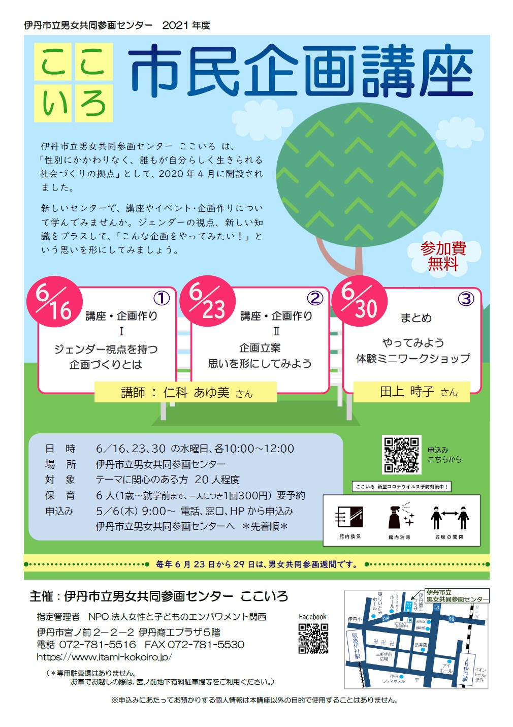 | 詳細: | ここいろ市民企画講座 伊丹市立男女共同参画センター ここいろは、「性別にかかわりなく、 誰もが自分らしく生きられる社会づくりの拠点」として、2020年4月 に開設されました。新しいセンターで、講座やイベント・企画作りに ついて学んでみませんか。ジェンダーの視点、新しい知識をプラスして、 「こんな企画をやってみたい!」という思いを形にしてみましょう。 日時:6/16、23、30(水曜日) 各10~12時 [3回講座] 内容: ①講座・企画作りⅠ ジェンダー視点を持つ企画づくりとは ②講座・企画作りⅡ 思いを形にしてみよう ③まとめ やってみよう 体験ミニワークショップ 講師:①②仁科あゆ美さん(一般財団法人大阪府男女共同参画推進財団 理事・本部長) ③田上時子さん(NPO法人女性と子どものエンパワメント関西 理事長) 対象:テーマに関心のある方 20人程度(先着順) 保育:6人(1歳~就学前まで、一人につき1回300円)要予約 申込み:電話、窓口、センターHPから受付 主催・問い合わせ:伊丹市立男女共同参画センター ここいろ 伊丹市宮ノ前2-2-2 伊丹商工プラザ5階 電話:072-781-5516 FAX:072-781-5530 |