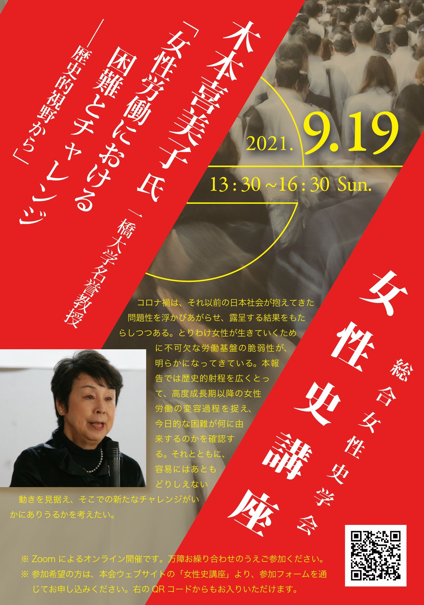 | 詳細: | 2021年度 女性史講座(近現代例会) 日時:2021年9月19日(日) 13:30~16:30 会場:Zoomによるオンライン開催(以下のフォームからお申し込みください) 講師:木本喜美子氏(一橋大学名誉教授) 題名:「女性労働における困難とチャレンジ―歴史的視野から―」 趣旨:コロナ禍は、それ以前の日本社会が抱えてきた問題性を浮かび上がらせ、露呈する結果をもたらしつつある。とりわけ女性が生きていくために不可欠な労働基盤の脆弱性が、明らかになってきている。本報告では歴史的射程を広くとって、高度成長期以降の女性労働の変容過程を捉え、今日的な困難が何に由来するのかを確認する。それとともに、容易にはあともどりしえない動きを見据え、そこでの新たなチャレンジがいかにありうるかを考えたい。 講師略歴:一橋大学名誉教授。博士(社会学)。立命館大学産業社会学部助教授を経て1990年より一橋大学社会学部教授。専門は家族と労働の社会学。主著に『家族・ジェンダー・企業社会――ジェンダー・アプローチの模索』(ミネルヴァ書房、1995年)、『女性労働とマネジメント』(勁草書房、2003年)、共編著に『社会政策のなかのジェンダー』(明石書店、2010年)、共著に『仕事の人類学—労働中心主義の向こうへ』(世界思想社、2016年)、編著に『家族・地域のなかの女性と労働――共稼ぎ労働文化のもとで』(明石書店、2018年)など。 参加申込フォーム:https://forms.gle/W619psE3EqLpGvnA9 (申込期限 9月12日(日)) なお、今回の女性史講座は近現代史例会との合同開催です。会員のみなさまもふるってご参加ください |