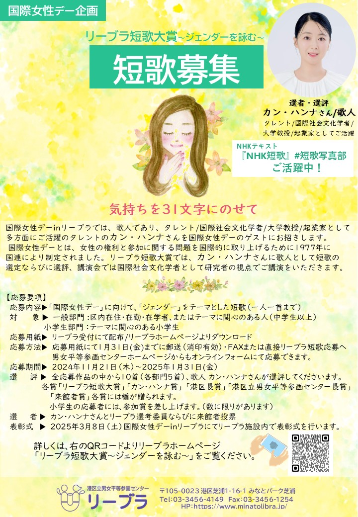 | 詳細: | 短歌募集! リーブラ短歌大賞 ~ジェンダーを詠む~ 国際女性デーinリーブラ(2025年3月8日)に向けて「ジェンダー」をテーマとした短歌を募集します。選定と選評は、NHKテキスト『NHK短歌』#短歌写真部 にてご活躍中の カン・ハンナ さん(歌人/タレント/国際社会文化学者/大学教授/起業家)とリーブラ選考委員ならびに来館者投票で行われます。 【表彰式】2025年3月8日 【応募内容】「国際女性デー」に向けて、「ジェンダー」をテーマとした短歌(一人一首まで) 【対 象】小学生部門:港区在住・在学の小学生、ならびにテーマに関心のある小学生 一般部門 :港区在住・在勤・在学者(中学生以上)、ならびにテーマに関心のある人 ※1人1回限りまで応募可能 【HP(講座案内)】 https://www.minatolibra.jp/events/course20241121/ 【応募方法】 オンラインフォームまたは応募用紙にて1月31日(金)までに郵送・FAXまたは直接リーブラ短歌応募箱へ。 ★オンラインフォーム https://forms.gle/TiHbtdhG772sD2Jr6 【応募用紙】 パンフレット裏面/リーブラ受付/リーブラHP講座案内にてダウンロード 【応募期間】 2024年11月21日(木)~ 2025年1月31日(金) 【賞】 全応募作品の中から10首(各部門5首)一般部門・小学生部門 リーブラ短歌大賞/カン・ハンナ賞/港区長賞/リーブラセンター長賞/来館者賞 【表彰式】 2025年3月8日(土)国際女性デーinリーブラにてリーブラ施設内で表彰式を行います。カン・ハンナさんもご来館され選評をいただきます。 【選者・選評】 カン・ハンナさん (歌人/タレント/国際社会文化学者/大学教授/起業家)とリーブラ選考委員ならびに来館者投票 |