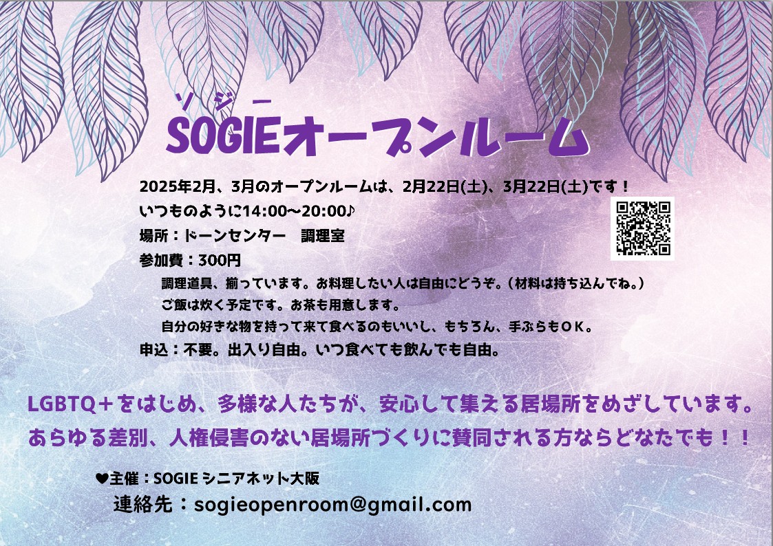 | 詳細: | 2025年2月オープンルーム 日時:2月22日(土) 14:00〜20:00 場所:ドーンセンター 調理室 参加費:300円 調理道具は揃っているので、料理したい人は自由にどうぞ。(材料は持ち込んでください。) ご飯は運営人が炊く予定。お茶も用意あり。 自分の好きな物を持って来て食べるのもいいし、もちろん、手ぶらもOK。 申込:不要。出入り自由。いつ食べても飲んでも自由。 LGBTQ+をはじめ、多様な人たちが、安心して集える居場所をめざしています。 あらゆる差別、人権侵害のない居場所づくりに賛同される方ならどなたでも!! 主催:SOGIEシニアネット大阪 連絡先:sogieopenroom@gmail.com |