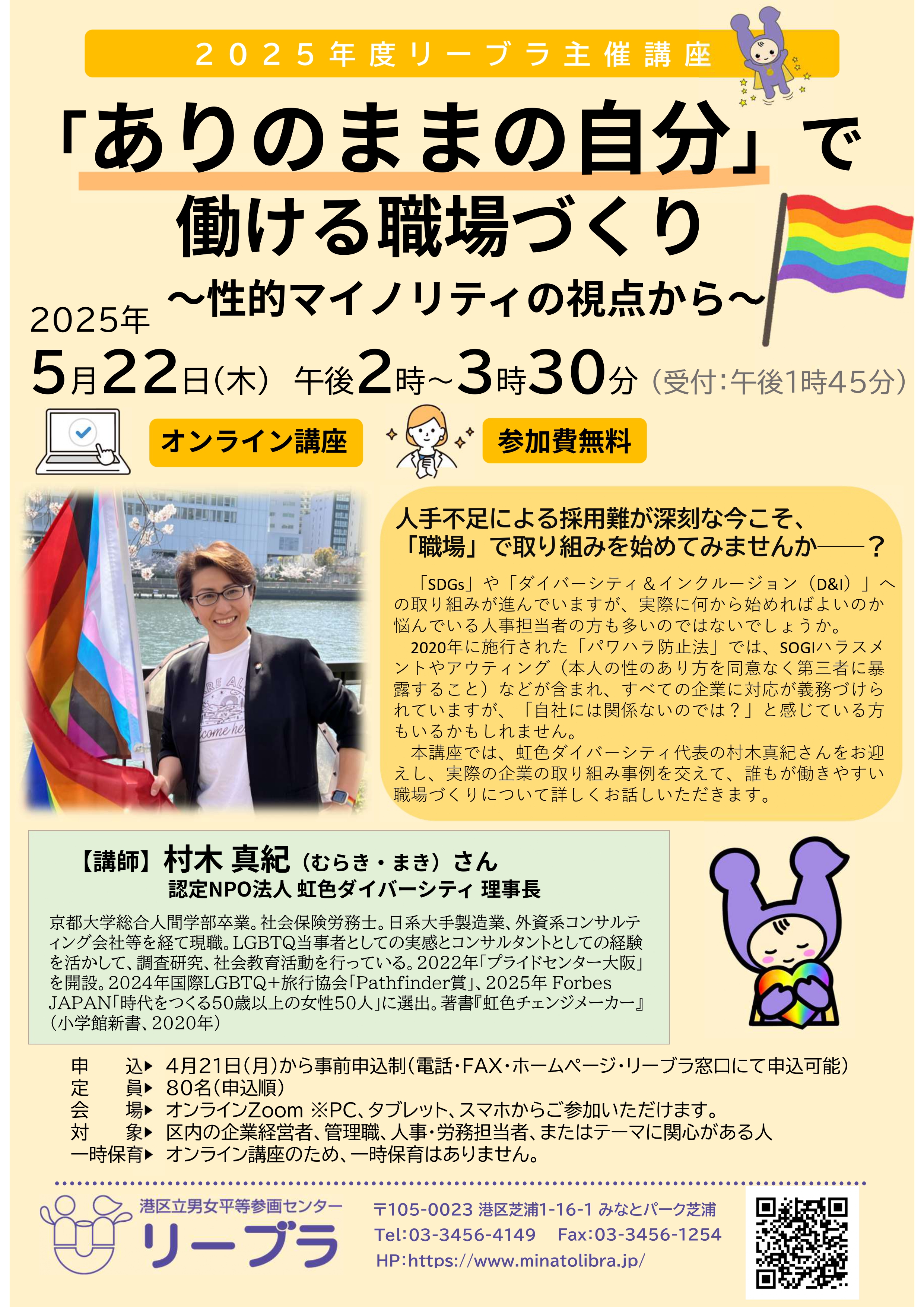 | 詳細: | 港区立男女平等参画センター(愛称:リーブラ)では、2025年5月22日(木)午後2時から主催講座「『ありのままの自分』で働ける職場づくり〜性的マイノリティの視点から〜」を開催します。参加は無料で、事前申し込み制となっております。下記、詳細となります。 〈開催概要〉 ■講座名称:「ありのままの自分」で働ける職場づくり〜性的マイノリティの視点から〜 ■講座概要:人手不足による採用難が深刻な今こそ、「職場」で取り組みを始めてみませんか──? 「SDGs」や「ダイバーシティ&インクルージョン(D&I)」への取り組みが進んでいますが、実際に何から始めればよいのか悩んでいる人事担当者の方も多いのではないでしょうか。 2020年に施行された「パワハラ防止法」では、SOGIハラスメントやアウティング(本人の性のあり方を同意なく第三者に暴露すること)などが含まれ、すべての企業に対応が義務づけられていますが、「自社には関係ないのでは?」と感じている方もいるかもしれません。 本講座では、虹色ダイバーシティ代表の村木真紀さんをお迎えし、実際の企業の取り組み事例を交えて、誰もが働きやすい職場づくりについて詳しくお話しいただきます。 ■講師:村木 真紀(むらき・まき)さん 認定NPO法人 虹色ダイバーシティ 理事長 京都大学総合人間学部卒業。社会保険労務士。日系大手製造業、外資系コンサルティング会社等を経て現職。LGBTQ当事者としての実感とコンサルタントとしての経験を活かして、調査研究、社会教育活動を行っている。2022年「プライドセンター大阪」を開設。2024年国際LGBTQ+旅行協会「Pathfinder賞」、2025年 Forbes JAPAN「時代をつくる50歳以上の女性50人」に選出。著書『虹色チェンジメーカー』(小学館新書、2020年) ■日程:2025年5月22日(木)午後2時~3時30分(受付:午後1時45分) ■会場:オンライン開催(zoom) ■費用・定員:無料(事前申し込み制)・80名(申し込み順) ■対象:区内の企業経営者、管理職、人事・労務担当者、またはテーマに関心がある人 ■申込:下記URLの申込フォームからお申込みください。 https://www.minatolibra.jp/events/course20250522/ |
