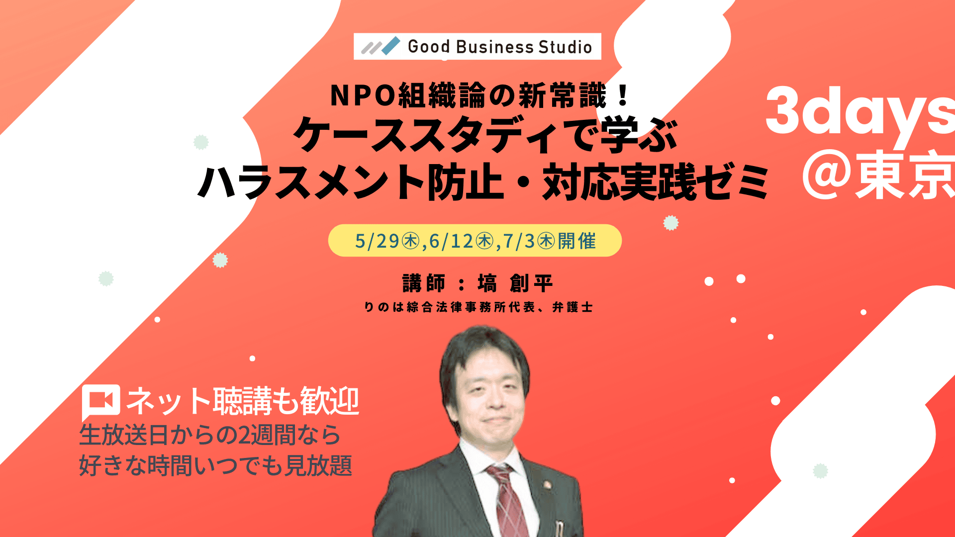 【5月29日(木),6月12日(木),7月3日(木)開催】NPO組織論の新常識!ケーススタディで学ぶ「ハラスメント防止・対応」実践ゼミ(団体プラン対応ゼミ)