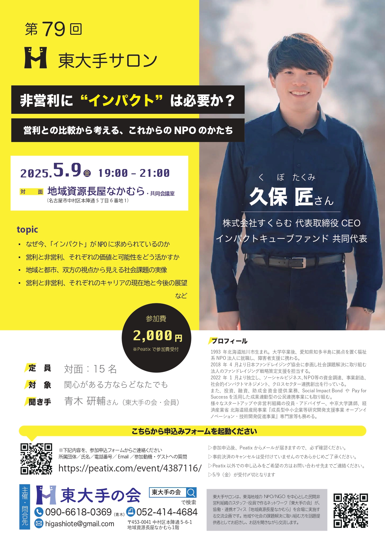 | 詳細: | 東大手サロン【第79回】非営利に“インパクト”は必要か?―営利との比較から考える、これからのNPOのかたち 開催のご案内 ○東大手サロンとは 東大手サロンは、東海地域のNPO/NGOを中心とした民間非営利組織のスタッフ・役員で作るネットワーク「東大手の会」が実施する交流企画です。地域や社会の課題解決に取り組む方を話題提供者としてお招きし、お話を聞きながら交流します。 【日 時】2025年5月9日(金)19時~21時 【参加方法】地域資源長屋なかむら・共同会議室(名古屋市中村区本陣通5丁目6番地1) 【定 員】15名 【参加費】2,000円 ※Peatixで参加費受付 【参加対象】話題に関心のある方ならどなたでも 【話 題】非営利に“インパクト”は必要か?―営利との比較から考える、これからのNPOのかたち 【話題提供】 久保匠(くぼたくみ)さん(株式会社すくらむ 代表取締役CEO/インパクトキューブファンド共同代表) 1993年北海道旭川市生まれ。大学卒業後、愛知県知多半島に拠点を置く福祉系NPO法人に就職し、障害者支援に携わる。 2018年4月より日本ファンドレイジング協会に参画し社会課題解決に取り組む法人のファンドレイジング戦略策定支援を担当する。 2022年1月より独立し、ソーシャルビジネス、NPO等の資金調達、事業創造、社会的インパクトマネジメント、クロスセクター連携創出を行っている。 また、投資、融資、助成金資金提供業務、Social Impact BondやPay for Successを活用した成果連動型の公民連携事業にも取り組む。 様々なスタートアップや非営利組織の役員・アドバイザー、中京大学講師、経済産業省 北海道経産局事業『成長型中小企業等研究開発支援事業 オープンイノベーション・技術開発促進事業』専門家等も務める。 【主なトピック】 ・なぜ今、「インパクト」がNPOに求められているのか ・営利と非営利、それぞれの価値と可能性をどう活かすか ・地域と都市、双方の視点から見える社会課題の実像 ・営利と非営利、それぞれのキャリアの現在地と今後の展望 など 【進 行】青木研輔(東大手の会・代表世話人) <申込方法> ※下記内容を、参加申込フォームからご連絡ください 所属団体/氏名/電話番号/Email/参加動機・ゲストへの質問 <問い合わせ先> 東大手の会 FAX 052-414-4684 Email higashiote@gmail.com <参加申込> ※5/9(金)17時が受付〆切となります ↓Peatixのイベントページからお申し込みください。 https://peatix.com/event/4387116/ ※参加申込後、Peatixからメールが届きますので、必ず確認ください。 ※事前決済のキャンセルは受付けていませんのであらかじめご了承ください。 ※Peatix以外での申し込みをご希望の方はお問い合わせ先までご連絡ください。 【主催】東大手の会 https://blog.canpan.info/higashiote/ 東海地域のNPO/NGOを中心とした民間非営利組織のスタッフ・役員で作るネットワークとしてNPO向けの研修・交流機会の提供、NPOに関する調査研究に取り組んでいます。 |
