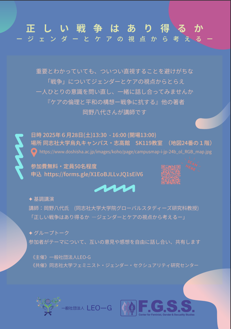 | 詳細: | 重要とわかっていても、ついつい直視することを避けがちな「戦争」について、 ジェンダーとケアの視点からとらえ、一人ひとりの意識を問い直し、一緒に話し合ってみませんか。 講師は、『ケアの倫理と平和の構想―戦争に抗する』他の著者 岡野八代さんです。 《開催日時》2025年6月28日(土)13:30~16:00(開場 13:00) 《会場》同志社大学烏丸キャンパス・志高館 SK119教室 (地図24番の1階) 《基調講演》 講師:岡野八代さん (同志社大学大学院グローバルスタディーズ研究科教授) 「正しい戦争はあり得るか ―ジェンダーとケアの視点から考えるー」 《グループトーク》 参加者がテーマについて、互いの意見や感想を自由に話し合い、共有します。 《対象》テーマに関心のある方 《募集人数》50名程度 《参加費》無料 《申込み》https://forms.gle/X1EoBJLLvJQ1sEiV6 《主催》一般社団法人LEO-G 《共催》同志社大学フェミニスト・ジェンダー・セクシュアリティ研究センター |