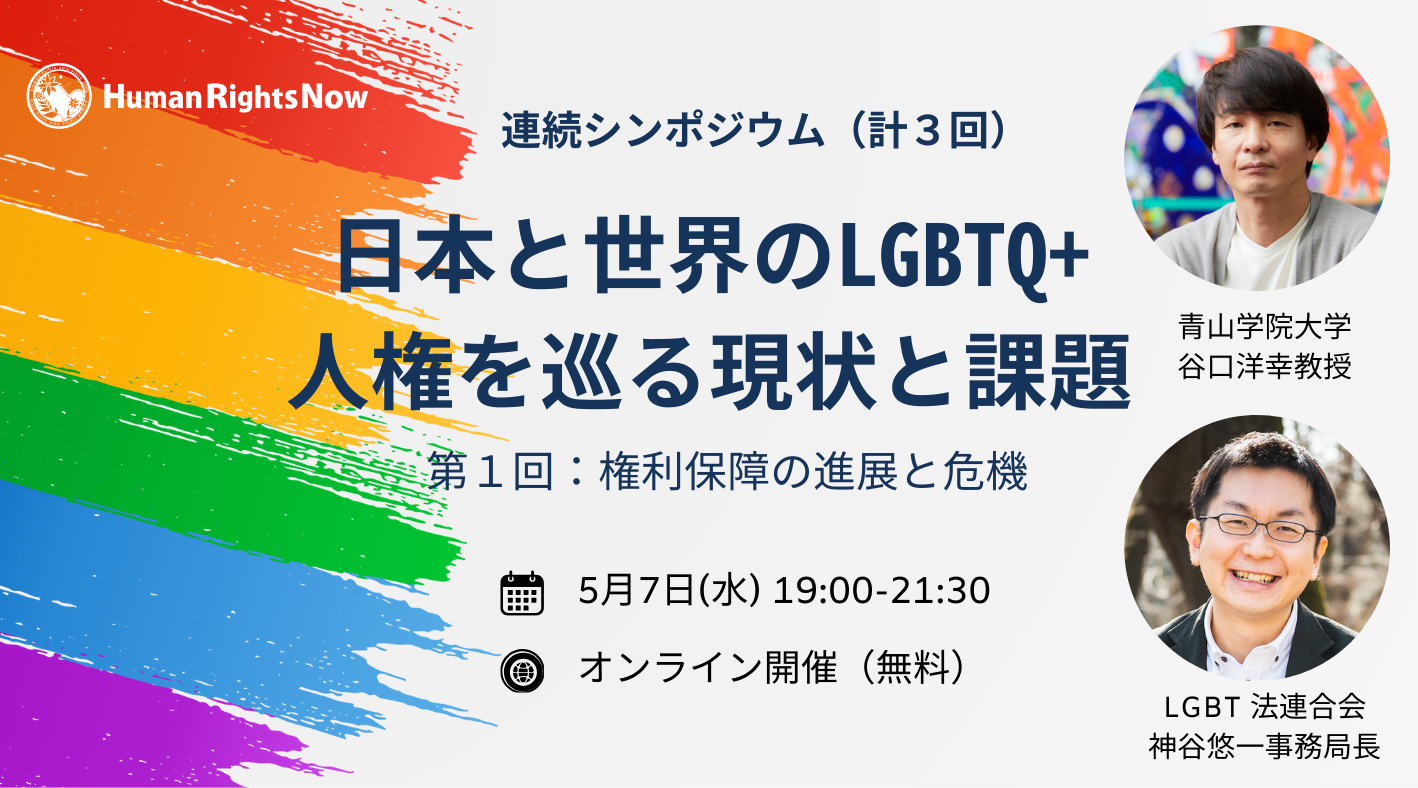 | 詳細: | 近年、国内外のニュースで注目されている性的マイノリティ(LGBTQ+)の人権問題。同性婚の法制化など権利保障が進む一方で、差別や嫌悪を表明する動きも世界的に起きています。ヒューマンライツ・ナウは、国際人権としては比較的新しい分野であるLGBTQ+の⼈権問題の構造を読みとき、直面している問題や解決すべき課題について考える計3回のオンラインシンポジウムを開催します。 第1回は基礎編として、LGBTQ+を巡る国内外の人権状況と今後の課題について、⻘⼭学院⼤学教授の⾕⼝洋幸氏と、LGBT 法連合会事務局⻑の神⾕悠⼀氏に聞きます。2023年にLGBT理解増進法が施行されて何が変わったのか。ハンガリーの反LGBT法やトランプ政権による反DEI政策が国際社会に与える影響は―。一緒に学び、考えてみませんか。 【日時】2025年5月7日(水)19:00~21:30 【開催方法】Zoomによるオンライン開催 【参加費】無料 【申込方法】https://20250507hrn.peatix.com/ 【申込締切】2025年5月7日(水)正午 【ゲストスピーカー】 ⾕⼝洋幸氏 中央大学大学院法学研究科博士課程修了。高岡法科大教授、金沢大准教授などを経て、2021年より現職。日本学術会議連携会員。ジェンダー法学会理事、日本GI(性別不合)学会理事。 神⾕悠⼀氏 一橋大学大学院社会学研究科修士課程修了。一橋大学大学院社会学研究科客員准教授、自治研作業委員会「LGBTQ+/SOGIE自治体政策」座長などを歴任し、2015年より現職。 【問い合わせ先】info@hrn.or.jp |