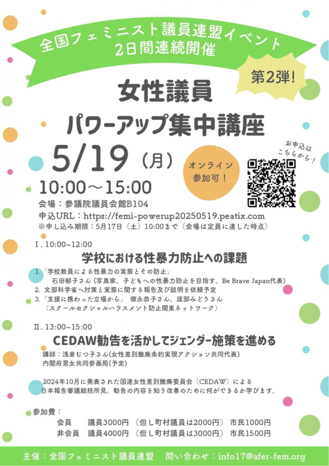 | 詳細: | 全国フェミニスト議員連盟2日連続イベント開催 第2弾! 女性議員パワーアップ集中講座 日時:2025年5月19日(⽉) 10:00〜15:00 会場:参議院議員会館 B104(オンラインあり) 講座Ⅰ.10:00~12:00 「学校における性暴力防止への課題」 講師:⽯⽥郁⼦さん(写真家、⼦どもへの性暴⼒防⽌を⽬指す、BeBraveJapan代表) ⽂部科学省(予定) 徳永恭⼦さん、渡部みどりさん(スクールセクシャルハラスメント防止関東ネットワーク) 講座Ⅱ.13:00~15:00 「CEDAW勧告を活かしてジェンダー施策を進める」 講師:浅倉むつ⼦さん(⼥性差別撤廃条約実現アクション共同代表) 内閣府男⼥共同参画局(予定) 参加費: 会員 市区県国議員3,000円/町村議員2,000円/市⺠1,000円 ⾮会員 市区県国議員4,000円/町村議員3,000円/市⺠1,500 今、問題視される重要なテーマについて、詳しい講師による現状や課題、担当省庁よる取組等の説明をいただき、今後の活動へとつなげていきます。 |