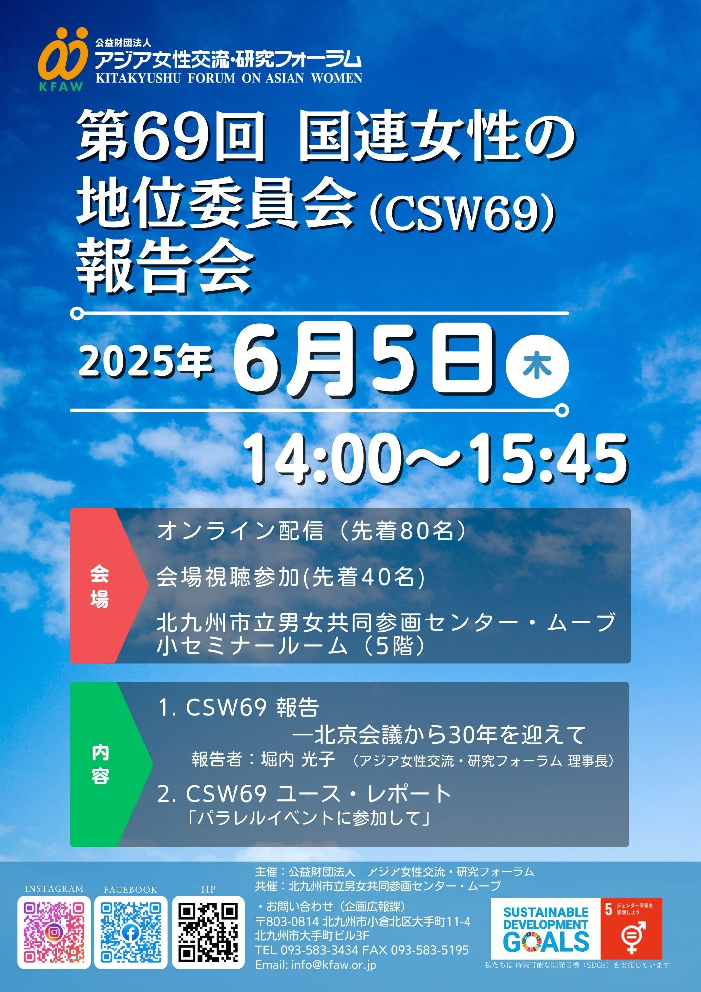 | 詳細: | ニューヨークの国連本部で開催される国連女性の地位委員会(CSW)。第4回世界女性会議(於北京)から30周年となる今年3月開催のCSW69では、日本を含む159カ国からの報告等のレビュー・評価を行い、政治宣言を発出しました。 KFAWでは、CSW69を振り返り、6月5日(木)に当財団の理事長堀内光子が、CSW69の概要をわかりやすく報告します。 また、現地で参加したユースレポーターから、パラレルイベントなどに参加した感想などを報告いただきます。 皆様のご参加をお待ちしております。 |
