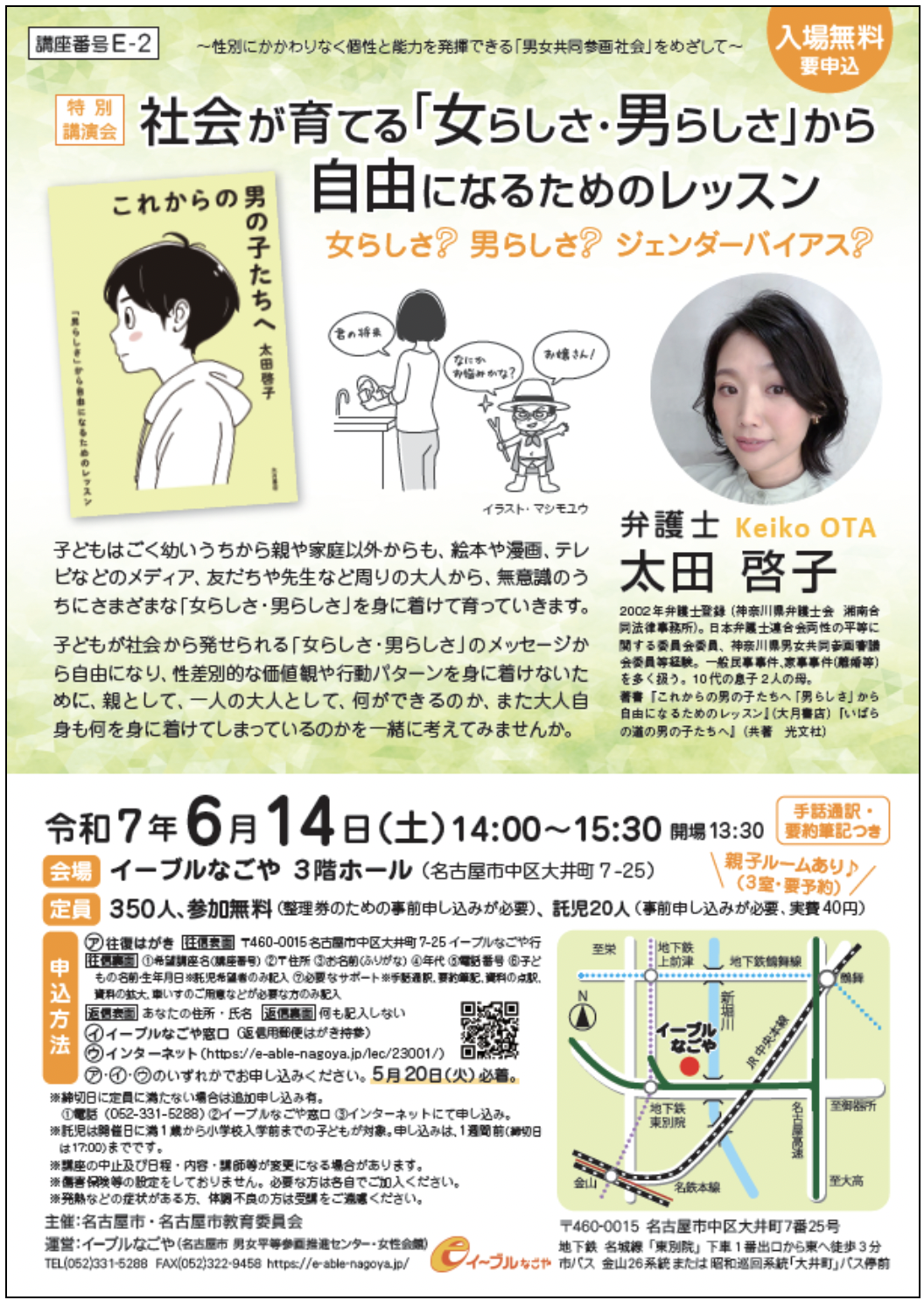 | 詳細: | 社会が育てる「女らしさ・男らしさ」から自由になるためのレッスン 6月14日(土曜日)14:00~15:30(全1回) 概要 主催 名古屋市、名古屋市教育委員会 運営 イーブルなごや 講師 太田 啓子(弁護士) 対象・定員 どなたでも 350人 受講料 無料 整理券は不要です。 当日会場の3階ホール受付へお越しください。 5月21日(水曜日)以降、事前申し込みは不要になりました。 事前申し込みのない方の当日参加も可能ですので、お誘い合わせの上お越しください。 託児を利用される方は、6月7日(土曜日)(締切日は午後5時)までに電話でお申し込みください。 会場 ホール 託児 |
