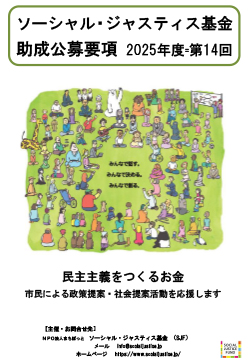 | 詳細: | 【公募テーマ】 ~両テーマとも、未来を担う世代が中心になって取り組む活動を積極的に支援します~ *特設テーマ:『ネット/SNSにかかる社会的公正・人権の問題』に取り組むアドボカシー活動 *基本テーマ:『見逃されがちだが、大切な問題』に取り組むアドボカシー活動 【助成金額】 1案件の助成金額の上限を100万円とし、総額400万円の助成を予定しています(テーマ別の助成総額は申請状況を鑑みて審査過程で決定)。 ※自己資金充当、費用項目についての条件はありません(助成金は人件費にも充当可能)。 【助成期間】 2026年1月から1年間以上2年間以下(助成の終了月は26年12月から27年12月までで任意の月を申請可能)。 【応募資格】 ※抜粋 公募テーマに即し、以下の大項目を満たす団体・法人(法人格を問わない)・個人の事業が対象です。 1)「不公正の是正」・「市民社会の形成」を目的とした事業であること 2)SJFアドボカシーカフェを共催し、多様な市民との対話ができること 3)SJF助成発表フォーラムへの参加 4)中間期、助成活動終了後の報告 【詳細】 上記は抜粋です。ご応募に際しては、必ず 専用ページ( https://socialjustice.jp/p/2025fund/ )にてダウンロードできる「SJF助成公募第14回要項2025」で詳細をご確認ください。 ~市民の力で希望ある未来をつくりだす、その一歩を応援します。公正な社会を実現する主役は、みなさんです。多様な人びとの意見が受けとめられエンパワーされる社会を希求し、見逃されがちだが大切な問題に取り組むアドボカシー活動、とくに周縁化されたり封印されたりしている声をすくい上げて社会の仕組みや法制度づくりに生かすアドボカシー活動を支援します。 SJFの助成事業は、資金支援と社会対話の場づくりを両輪として進めています。後者として、「SJFアドボカシーカフェ」や、多分野の市民活動が連携する土台になる「SJFフォーラム」等を助成先の皆様とともに企画しています。助成先ごとにSJF助成担当者が伴走します~ ★SJFアドボカシーカフェの最新情報 https://socialjustice.jp/p/category/cafe/ ★これまでの助成公募の審査決定概要 https://socialjustice.jp/p/fund/ ★これまでの助成先の活動の様子 https://socialjustice.jp/p/fund/fund_group/ ★アドボカシーとは https://socialjustice.jp/p/advocacy/ |