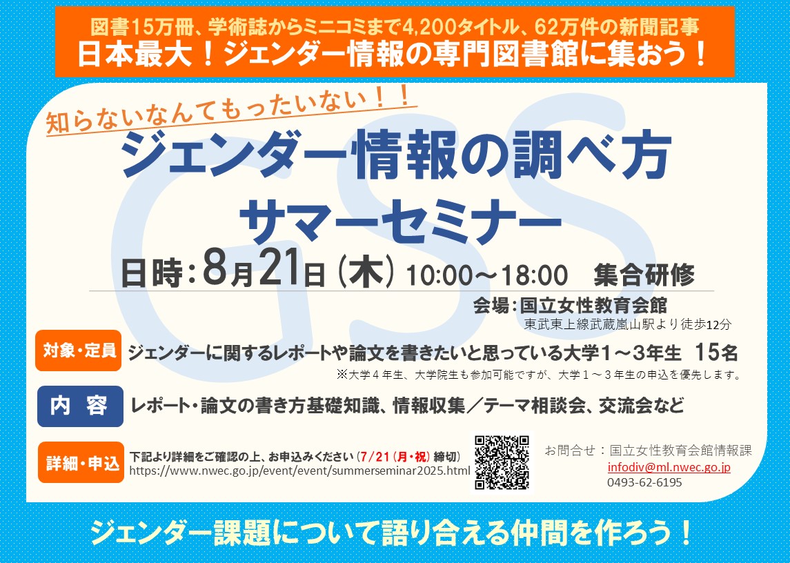 | 詳細: | 独立行政法人国立女性教育会館(NWEC 所在地:埼玉県比企郡嵐山町)は、2025年8月21日に「知らないなんてもったいない!ジェンダー情報の調べ方 サマーセミナー」を開催します。NWEC女性教育情報センター所蔵の図書15万冊、学術誌からミニコミまで4,200タイトルの逐次刊行物、62万件の新聞記事の活用、ジェンダー研究専門家のチューターの先生方へのテーマ相談会や、参加者間の交流を通して、学習・研究の内容を深めると同時に、ジェンダー課題について語り合える仲間作りの場を提供します。 【開催概要】 開催日時:2025年8月21日 10:00〜18:00 開催形式:対面 参加費:無料 対象・定員:ジェンダーに関するレポートや論文を書きたいと思っている大学学部1~3年生 15名程度 ※大学4年生、大学院生も参加は可能ですが、大学1~3年生の申込を優先します。 【プログラム】 10:00~10:10 オープニング 10:10~10:50 「アイスブレイク「お互いを知ろう!」 11:00~12:00 講義「レポート・論文執筆の“お作法”」 12:00~13:00 ランチ交流会 13:00~13:40 女性教育情報センター・女性アーカイブセンター見学 13:40~16:40 情報収集/テーマ相談会 16:50~17:50 ワークシート作成・発表/交流会 17:50~18:00 クロージング |