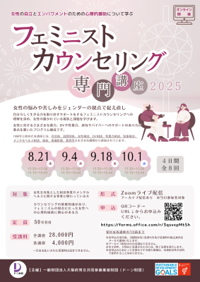 | 詳細: | 女性の相談にあたる際には、女性が置かれている状況や、問題の背景にある社会的要因を、ジェンダーの視点で読み解くことが求められます。 本講座では、女性の悩みや苦しみをジェンダーの視点で捉え直し、自分らしく生きる力を取り戻すサポートをするフェミニストカウンセリングへの理解を深め、女性の自立とエンパワメントのための心理的援助の実践に向けた必要な知識と技術を学びます。 女性に対するさまざまな暴力、DVや性暴力、虐待サバイバーへのサポートのあり方に重点を置いたプログラム構成です。 日々の相談・支援の視点の整理や、学びを深める研修の機会としてぜひご活用ください。 ---------------------------------------------------------------------------------------- 【講座日程・タイトル】 ■8月21日(木) ① 「フェミニストカウンセリング」とは ~カウンセリングにジェンダーの視点を~ ② トラウマを持つ女性への臨床的サポート ■9月4日(木) ③ 女性の心とからだ ~リプロダクティブ・ヘルス&ライツの視点から~ ④ こころの回復のプロセス ~女性支援団体の取組みから~ ■9月18日(木) ⑤ 多様な性 ~当事者・家族への支援~ ⑥ 支援者のケア~自分を守る・チームで支え合う~ ■10月1日(水) ⑦ 子ども・若年層の性暴力被害の実態と支援のあり方 ⑧ 法と司法に潜むジェンダー ---------------------------------------------------------------------------------------- 【形式】オンライン(Zoomミーティングで実施) ※アーカイブ配信あり(当日参加者対象) ---------------------------------------------------------------------------------------- 【対象】 ・女性を対象とした相談事業やメンタルヘルスに関する事業に関わっている方 ・カウンセリングの基礎知識があり、フェミニズムの視点にたった女性への心理的支援に関心がある方 ---------------------------------------------------------------------------------------- 【定員】50名程度 ---------------------------------------------------------------------------------------- 【受講料 】全講座 28,000円、各講座 4,000円 ※一旦お支払いされた受講料は返金できませんのでご了承ください。 ---------------------------------------------------------------------------------------- 【申込方法】下記URLの申込フォームよりお申込みください。 https://forms.office.com/r/3qsvxpMtSh ---------------------------------------------------------------------------------------- 【申込締切】各講座の7日前まで(土日祝を除く) ---------------------------------------------------------------------------------------- ・お申込み受付後、1週間以内に受講可否及び受講料の振込案内をメールで通知します。 ※通知がない場合は、お手数ですが下記までご連絡ください。 ・全8回中、6回以上受講された方には、修了証書を発行します。 ・お申込みにあたってお預かりする個人情報は、本講座以外の目的で使用することはありません。 ========================================================================== 【問合せ先】 ドーン財団(一般財団法人大阪府男女共同参画推進財団) 〒530-0043 大阪市北区天満1丁目5番2号 トリシマオフィスワンビル803号室 TEL:06-7494-3005 FAX:06-7494-3006 Email: jigyo@dawn-ogef.jp Web site: https://www.dawn-ogef.jp/ ========================================================================== |