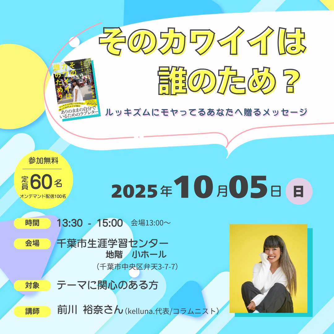 | 詳細: | かわいく/かっこよくなりたい!――それっていったい誰のため? 日常に潜むルッキズムの罠。誰かが決めた「こうでなきゃ!」に囚われていませんか。 そこで、自身のブランドやコラムを通してルッキズム問題を発信している講師から、向き合い方のヒントを起業のストーリーを交えながら伺います。 ※ルッキズム:人を外見や容姿で評価・判断する価値観 【講師】前川 裕奈さん(kelluna.代表/コラムニスト) 慶應義塾大学法学部卒。三井不動産に勤務後、早稲田大学大学院にて国際関係学の修士号を取得。 独立行政法人JICAでの仕事を通してスリランカに出会う。 後に外務省の専門調査員としてスリランカに駐在。2019年8月にセルフラブをテーマとした、フィットネスウェアブランド「kelluna.」をスリランカで起業。 kelluna.やコラム等を通して、日本のルッキズム問題を発信。著書に『そのカワイイは誰のため? ルッキズムをやっつけたくてスリランカで起業した話』(イカロス出版)。 趣味は、フルマラソン、漫画・アニメ、声優の朗読劇鑑賞。 【会場】千葉市生涯学習センター B1F 小ホール (千葉市中央区弁天3丁目7番7号) 及びオンデマンド(YouTube)配信 【対象】テーマに関心のある方 【定員】会場:60人(事前申込・先着順) アーカイブ配信(事前申込・当日まで) ★10/21頃~配信URL送付 【参加費】なし 【申込方法】電話、窓口、メール、または下記申込フォームより、 講座名、参加方法、氏名(ふりがな)、住所(都道府県・市町村)、 年齢、電話番号、メールアドレス〈アーカイブ希望の方のみ〉 をお知らせ(記載)いただき、お申込みください。 【申込フォーム】https://www.chp.or.jp/danjo/contact/ 【その他説明・備考】一時保育あり 無料・要申込(1歳6か月以上就学前児、受入人数に達し次第〆切) 【主催・申込先】千葉市男女共同参画センター 千葉市中央区千葉寺町1208-2 千葉市ハーモニープラザA棟 TEL:043-209-8771 e-mail:sankaku@f-cp.jp 【共催】千葉市生涯学習センター |