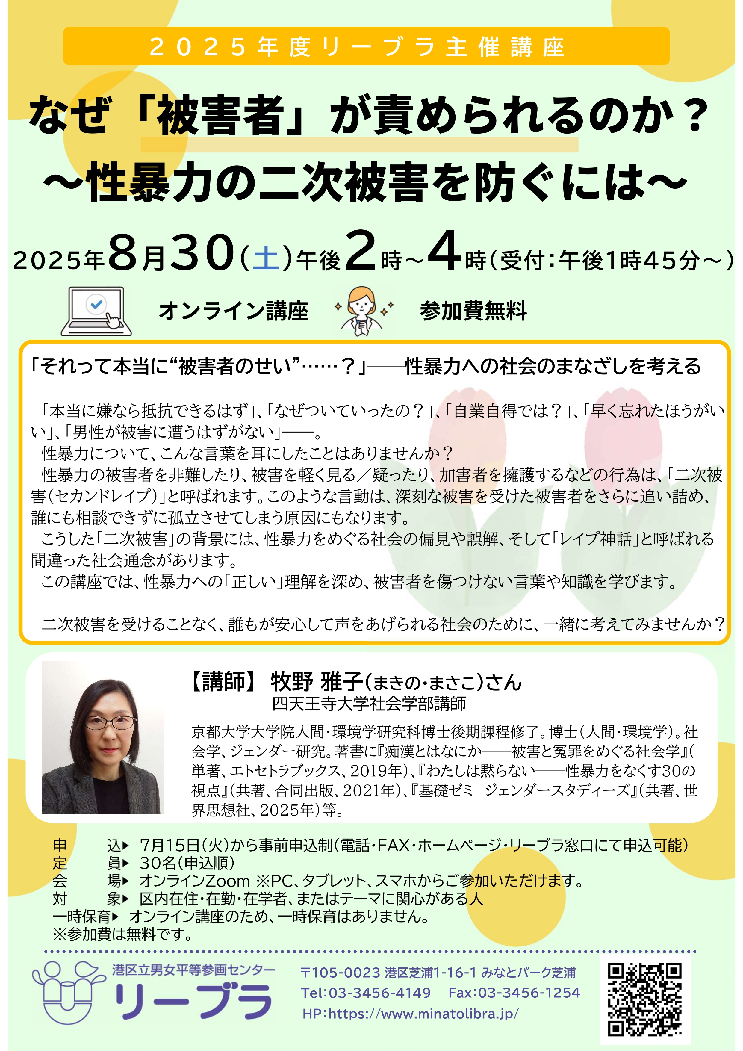 | 詳細: | 港区立男女平等参画センター(愛称:リーブラ)では、2025年8月30日(土)午後2時からオンライン主催講座「なぜ「被害者」が責められるのか?~性暴力の二次被害を防ぐには~」を開催します。参加は無料で、事前申し込み制となっております。下記、詳細となります。 《開催概要》 ■講座名:なぜ「被害者」が責められるのか?~性暴力の二次被害を防ぐには~ ■講座内容:「それって本当に“被害者のせい”……?」──性暴力への社会のまなざしを考える 「本当に嫌なら抵抗できるはず」、「なぜついていったの?」、「自業自得では?」、「早く忘れたほうがいい」、「男性が被害に遭うはずがない」――。 性暴力について、こんな言葉を耳にしたことはありませんか? 性暴力の被害者を非難したり、被害を軽く見る/疑ったり、加害者を擁護するなどの行為は、「二次被害(セカンドレイプ)」と呼ばれます。このような言動は、深刻な被害を受けた被害者をさらに追い詰め、誰にも相談できずに孤立させてしまう原因にもなります。 こうした「二次被害」の背景には、性暴力をめぐる社会の偏見や誤解、そして「レイプ神話」と呼ばれる間違った社会通念があります。 この講座では、性暴力への「正しい」理解を深め、被害者を傷つけない言葉や知識を学びます。 二次被害を受けることなく、誰もが安心して声をあげられる社会のために、一緒に考えてみませんか? ■講師:牧野 雅子(まきの まさこ)さん 四天王寺大学社会学部講師。京都大学大学院人間・環境学研究科博士後期課程修了。博士(人間・環境学)。社会学、ジェンダー研究。著書に『痴漢とはなにか──被害と冤罪をめぐる社会学』(単著、エトセトラブックス、2019年)、『わたしは黙らない──性暴力をなくす30の視点』(共著、合同出版、2021年)、『基礎ゼミ ジェンダースタディーズ』(共著、世界思想社、2025年)等。 ■日程:2025年8月30日(土)午後2時~4時(開場:午後1時45分~) ■会場:オンライン開催(zoom) ■費用・定員:無料(事前お申し込み制)・30名(申し込み順) ■対象:区内在住・在勤・在学者、またはテーマに関心がある方 ■申込:申込フォーム(https://www.minatolibra.jp/event/apply_on-line/?post_id=14576)からお申込みください。 |