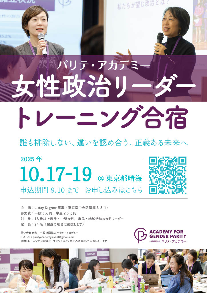 | 詳細: | 女性政治リーダートレーニング合宿 誰も排除しない、違いを認め合う、正義ある未来へ 女性のパワーで、みんなのための政治を実現しませんか?パリテ・アカデミーでは、女性がひとり一人自信をもって、仲間たちとつながり、政治について学びアクション出来るための2泊3日の政治リーダートレーニング合宿を開催します。 女性が意思決定に参加する必要性や自分の意見を効果的に伝える方法を学びます。また日本の現状に詳しい専門トレーナーを通じて選挙キャンペーンの具体像を習得します。政治を変えたいみなさんからの応募をお待ちしております。 日程 10/17(金14時30分~18(土)終日19(日)13時 場所 L stay & grow晴海 130㎡ 24名 104-0053 東京都中央区晴海3丁目8−1 参加費一般3万円・学生2万5千円(参加費には10/17(金)懇親会、宿泊、10/18(土)朝食、昼食、夕食、10/19(日)朝食、昼食が含まれます) 現地までの交通費は自己負担でお願いします。 期間 9月10日(水)締切 9月末までに参加の可否をお知らせします。 参加対象 18歳以上 若手・中堅女性 市民・地域活動の女性リーダー 募集 24名 |