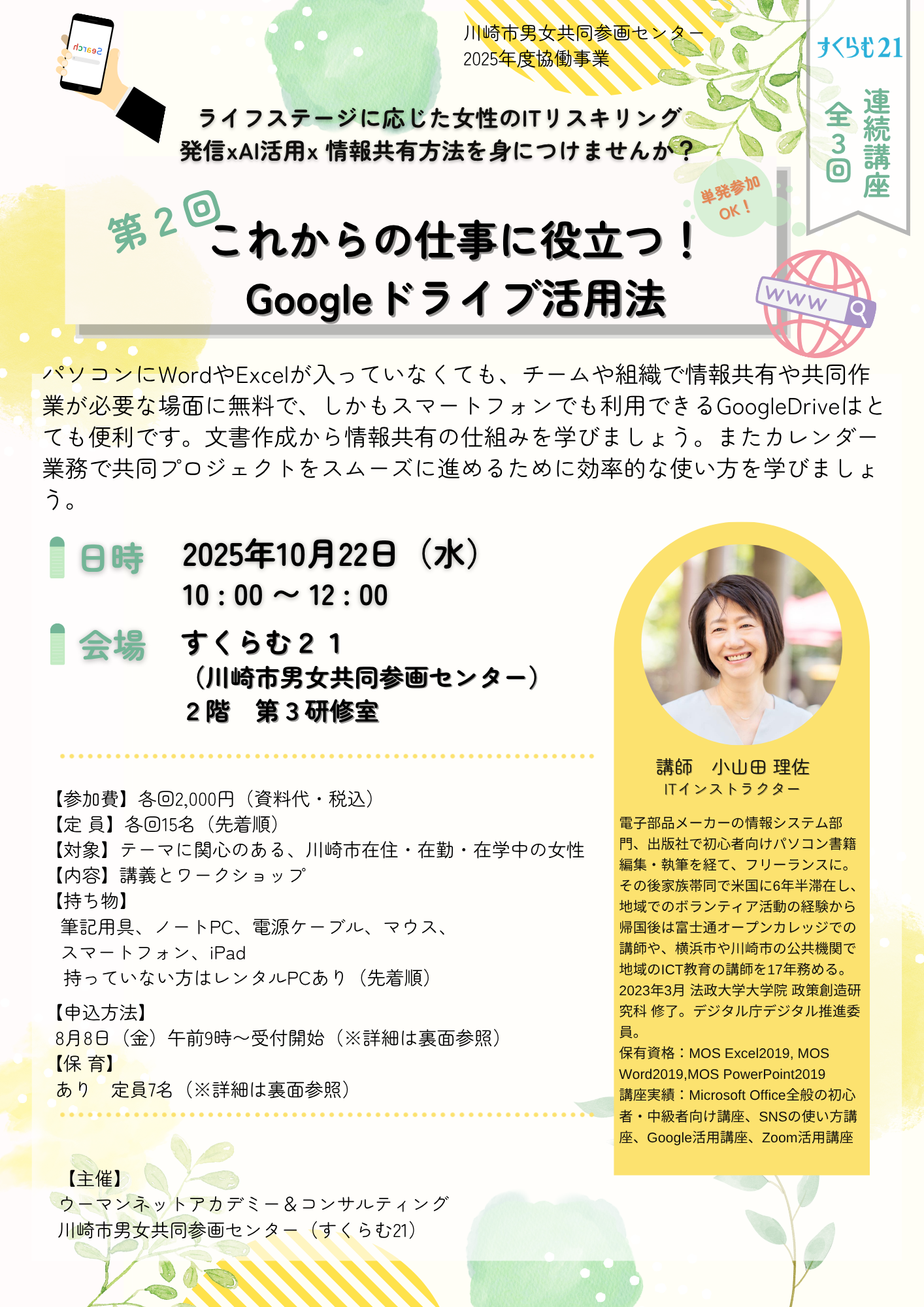| 詳細: | パソコンにWordやExcelが入っていなくても、チームや組織で情報共有や共同作業が必要な場面に無料で、しかもスマートフォンでも利用できるGoogleDriveはとても便利です。文書作成から情報共有の仕組みを学びましょう。またカレンダー業務で共同プロジェクトをスムーズに進めるために効率的な使い方を学びましょう。 【講義内容】 講義とワークショップ 参加費:※当日払い 2000円 (資料代・税込) 持ち物:筆記用具、ノートPC、電源ケーブル、マウス、スマートフォン、iPad / 持っていない方はレンタルPCあり(先着順) 保 育:1 歳~就学前まで (予約制・有料) ※開催の7日前までにウーマンネットアカデミー&コンサルティングのHPよりご予約ください。 定員:15名(先着順) 講師:ITインストラクター 小山田理佐 申込開始:8月8日(金)9:00〜 |