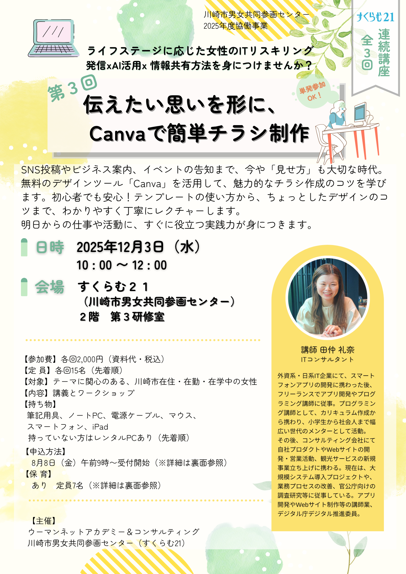 | 詳細: | SNS投稿やビジネス案内、イベントの告知まで、今や「見せ方」も大切な時代。無料のデザインツール「Canva」を活用して、魅力的なチラシ作成のコツを学びます。初心者でも安心!テンプレートの使い方から、ちょっとしたデザインのコツまで、わかりやすく丁寧にレクチャーします。 明日からの仕事や活動に、すぐに役立つ実践力が身につきます。 【講義内容】 講義とワークショップ 参加費:※当日払い 2000円 (資料代・税込) 持ち物:筆記用具、ノートPC、電源ケーブル、マウス、スマートフォン、iPad / 持っていない方はレンタルPCあり(先着順) 保 育:1 歳~就学前まで (予約制・有料) ※開催の7日前までにウーマンネットアカデミー&コンサルティングのHPよりご予約ください。 定員:15名(先着順) 講師:ITコンサルタント 田仲礼奈 申込開始:8月8日(金)9:00〜 |