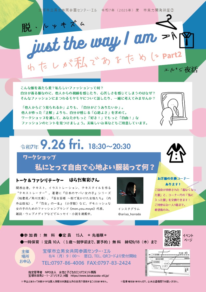 | 詳細: | ~脱・ルッキズム「わたしが私であるために」Part2~ ワークショップ「私にとって自由で心地よい服装って何?」 こんな服を着たら変?私らしいファッションって何? 自分が着る服なのに、他人からの視線を感じたり、心苦しさを感じてしまうのはなぜ? そんなファッションにまつわるモヤモヤについて話したり、一緒に考えてみませんか。 「他人からどう見られるか」よりも、「自分がどうありたいか」 ワークショップを通して、あなたがもっと「好き!」でもっと「自由!」なファッションのヒントを見つけましょう。 おいしいお茶などもご用意しています★ 日程) 2025年9月26日(金) 時間) 18時半~20時半 場所) 宝塚市立男女共同参画センター 講師) トーク&ファシリテーター はらだ有彩さん(テキストレーター) 定員・対象) 15人 参加費) 無料 保育) 一時保育あり 10人(1歳~就学前まで) 9/18(木)までに要予約 無料 ※お洋服の交換コーナーあります! ご自身が持参された「着なくなった服」と、コーナー内の「気に入った服」を交換できます! ご持参はお一人1着まで。希望者のみ。 申込方法) 8月4日(月)9:00~先着順。窓口、TEL、下記HPから受付。 https://www.takarazuka-ell.jp/lecture/shiminryoku20250926/ 主催 宝塚市立男女共同参画センター・エル 問い合わせ TEL:0797-86-4006 FAX:0797-83-2424 |