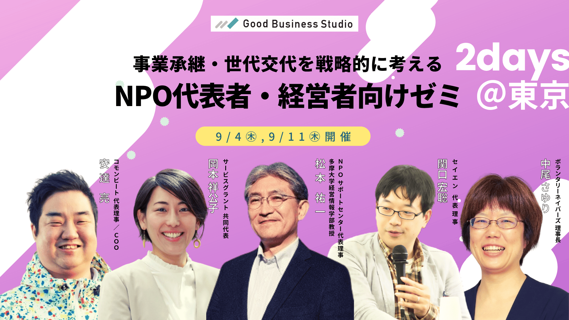| 詳細: | ━━━━━━━━━━━━━━━━━━ 事業承継・世代交代を戦略的に考える 「NPO代表者・経営者向けゼミ」(団体プラン対応ゼミ) ▼お申し込みと詳細はこちらから▼ https://npo-sc.org/training/good-business-studio/curriculum/25010/ ◇現地参加者は、質疑応答、ワークショップ参加、提出した課題に講師からのフィードバックを受けることができます。 ◆オンライン聴講(聴講生)は、生放送~2週間後まで、繰り返し視聴できます。 ━━━━━━━━━━━━━━━━━━ 全国のNPOの代表者を対象に実施した「NPO代表者白書」では、5年以内に代表交代を予定している団体が半数を超える一方で、準備が進んでいない実態や、候補者の不足が明らかになりました。 私たちはこの結果を受け、NPOの事業承継を「見過ごせない社会課題」と捉え、2023年には「NPO事業承継サミット」を開催。多くの現場の声に触れるなかで、組織の持続可能性や地域への影響を実感してきました。 今回のゼミは、その問題意識を出発点に、次世代に活動をつなぐための具体策を学ぶ実践型のプログラムです。 第1回では、「共同代表制」を取り入れた注目団体の事例を紹介し、導入までのプロセスや乗り越えた課題などを共有します。第2回では、専門家・中間支援組織の視点から、NPO向けの事業承継支援サービスや白書で見えた業界全体の構造をひも解きます。 次世代に活動をつなぐための具体策を探り、行動につながる知見を得る機会として、ぜひご参加ください。 【全2回のプログラム内容】 ■第1回 : NPOの事業承継のリアルな実践知を学ぶ 注目を集めるNPOの事業承継スタイル「共同代表制」 : ゲストNPO2団体による事例紹介 ■第2回 : NPOの事業承継の支援策と最新の動向 事業承継のNPO支援サービスの紹介 / 「NPO代表者白書」から読み解くNPOの事業承継の現状と課題 【参考リンク】NPOサポートセンター、NPOの代表810名に聞いた「NPO代表者白書」を発表 | PR TIMES https://prtimes.jp/main/html/rd/p/000000008.000124072.html 【日時】 第1回:9月4日(木)14:00-16:00 第2回:9月11日(木)14:00-16:00 【対象】 ・代表交代、事業承継を検討しているNPOの代表者や経営層 ・地域や活動の持続可能性を見据え、次世代への引継ぎを模索している方 ・組織基盤強化メニューを企画する中間支援組織やNPO支援コンサルタント 【持ち帰れる成果】 ・NPOの事業承継、代表交代の最新動向と構造的課題の理解 ・「共同代表制」など、柔軟かつ実践的な代表交代の仕組みと導入プロセス ・自団体における次世代への継承や、経営体制の再設計に向けたヒントと視座 ・NPOの事業承継支援につながる具体的なサービスの把握 【講師】 <第1回> 進行:関口 宏聡 (NPO法人セイエン 代表理事) 1984年生まれ、千葉県出身。2003年から環境NPOにて子ども自然体験活動などを行い、2009年、東京学芸大学卒業。2007年6月からシーズ・市民活動を支える制度をつくる会に勤務し、2009年の日本ファンドレイジング協会設立に尽力。2011年の「新寄付税制・NPO法改正」実現において、NPO側の現状や意見を取りまとめ、省庁・国会議員へのロビー活動を担った。この改正NPO法成立以降は、認定NPO法人制度の普及のため、日本全国を駆け巡り、これまでに300以上の講演をしてきているほか、NPO法人の認定NPO法人取得・維持の相談のコンサルティングを務める。2015年7月よりシーズの代表理事として、フードバンク活動やケアラー支援、災害救助法改正等のアドボカシー活動支援にも奮闘。2021年11月から現セイエンに事業承継し活動中。新宿区協働支援会議委員など。 ゲスト:岡本 祥公子 (認定NPO法人サービスグラント 共同代表) 慶応義塾大学総合政策学部卒。人材会社クリーク・アンド・リバー社で企業とクリエイターのマッチング業務に従事。2009年より週末ボランティアとしてサービスグラントに関わりをはじめ、初スタッフとして入職。2011年からは関西事務局長として大阪、神戸などでの活動を展開。2015年に東京に拠点を戻し、企業・行政等との協働プログラム運営、地域を応援する「ふるさとプロボノ」の推進のほか、人材研修プログラム「プロボノリーグ」、「ソーシャルアクションアカデミー」、「社会参加オープナー」なども担当。2019年の理事就任を経て、2025年4月より共同代表。2022年度 東京都人生100年時代社会参加施策検討委員会委員、2024年度 国分寺市協働事業審査委員。兵庫県宝塚市生まれ。 ゲスト:安達 亮 (NPO法人コモンビート 代表理事 / COO(Chief Operation Officer)) 1981年10月18日生まれ、東京都渋谷区出身。大学卒業後、そのまま企業就職することに違和感を抱き、多様な価値観と出会うべく2004年に地球一周の船旅「ピースボート」に乗船。船上でNPO法人コモンビートの活動に出会い、共感。帰国後すぐコモンビートの運営に参画、ミュージカル運営、NPO法人運営、ボランタリースタッフマネジメントを仕事にすること20年。2005年より事務局長、2014年より11年間理事長を務め、2025年より共同代表制の代表理事、CCO(Chief Operation Officer)に就