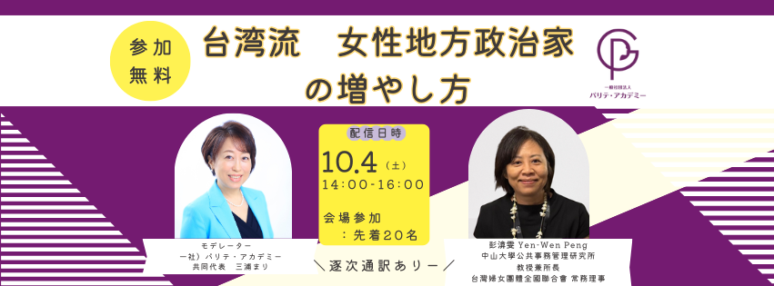 | 詳細: | 女性議員割合が日本よりはるかに高い台湾。その背景には、現場から生まれた工夫と戦略、そして制度設計の知恵があります。台湾で女性の政治参画がどのように進められてきたのか?今回、中山大学公共事務管理研究所 教授・所長の彭渰雯(ペン・イエンウェン)氏をお招きして、台湾における女性地方政治家の増やし方、その鍵を「現場目線」で読み解きます。アジアの先進事例に学び、日本の地域政治の未来を一緒に考えてみませんか? 2025年10月4日(土)14:00〜16:00 会場 オンラインウェビナー:100名 https://peatix.com/event/4504589/view 会場参加:先着20名(港区芝公園) ※会場参加チケット購入の方に開催場所をお知らせします。 |