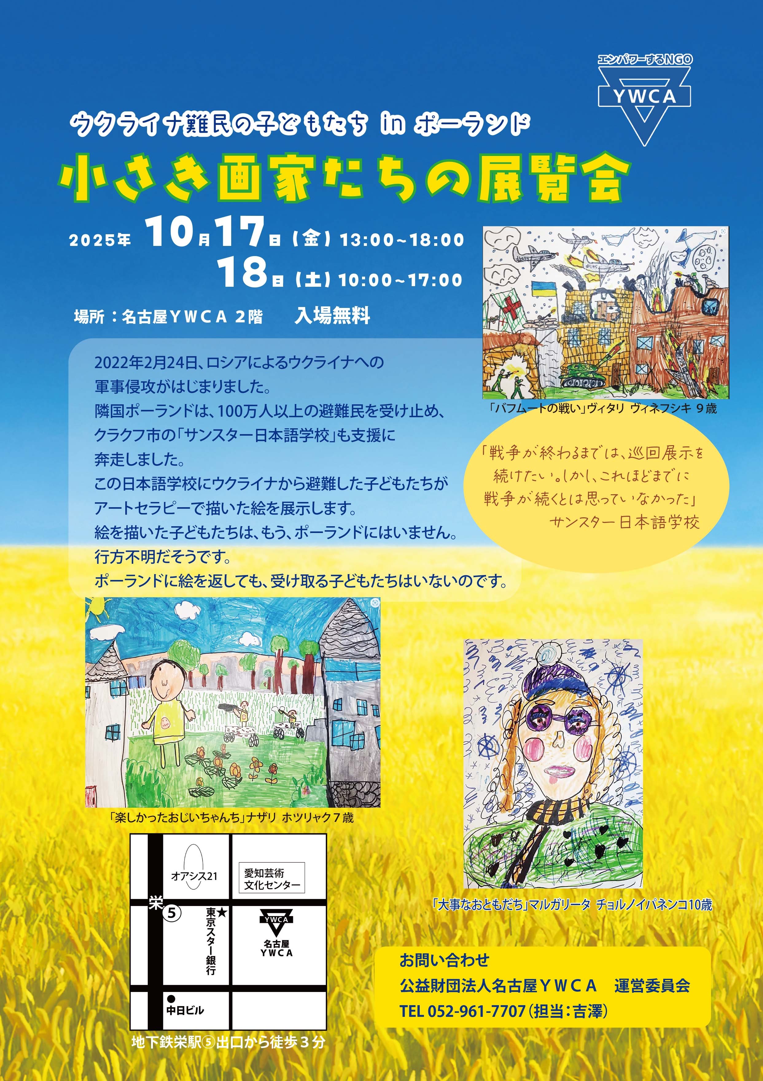 | 詳細: | 小さき画家たちの展覧会 ウクライナ難民の子どもたちinポーランド 10月17日(金)13時~18時 10月18日(土)10時~17時 名古屋YWCA 2階 入場無料 2022年2月24日、ロシアによるウクライナへの軍事侵攻がはじまりました。 隣国ポーランドは、100万人以上の避難民を受け止め、クラクフ市の「サンスター日本語学校」も支援に奔走しました。 この日本語学校にウクライナから避難した子どもたちがアートセラピーで描いた絵を展示します。 絵を描いた子どもたちは、もうポーランドにはいません。 行方不明だそうです。 ポーランドに絵を返しても、受け取る子どもたちはいないのです。 主催 公益財団法人名古屋YWCA 運営委員会 052-961-7707 yyy@nagoya-ywca.or.jp |