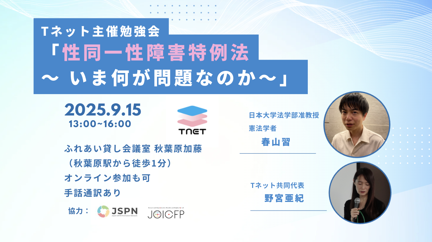 | 詳細: | トランスジェンダーの人々の法的性別変更に関わる「性同一性障害特例法」は、施行から20年以上が経過しました。この間、社会状況も変化し、国際的な人権基準との乖離も指摘され続けてきましたが、 2023年にはとうとう要件の一部に違憲判決が下されました。 これから特例法は改正されます。そこでTネットは、特例法についての勉強会を開催します。この法律にはどんな意義があり、どんな問題があったのか。そして、これからどんな法律が求められているのか。 トランスジェンダーの人々の法的性別承認について、初歩的な知識から発展的な学問的議論まで、ひろく学べる機会としたいと思います。当事者、支援者、研究者だけでなく、関心のあるすべての方のご参加をお待ちしています。 本イベントは都内およびオンラインで開催します。イベントには手話通訳が付きます。申し込みはこちらよりお願いします。アーカイブ配信もあります。 https://tnet202509.peatix.com/view *本イベントはJSPN/ジョイセフの協力を得て開催します。 |