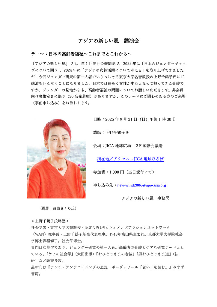 | 詳細: | 「アジアの新しい風」では、年1回発行の機関誌で、2022年に「日本のジェンダーギャップについて問う」、2024年に「アジアの女性活躍について考える」を取り上げてきましたが、今回ジェンダー研究の第一人者でいらっしゃる東京大学名誉教授の上野千鶴子氏にご講演をいただくことになりました。日本では長らく女性が中心となって担ってきた介護ですが、ジェンダーの見地からも、高齢者福祉の問題についてお話しいただきます。非会員向け募集定員に限り(30名先着順)がありますが、このテーマにご関心のある方のご来場(事前申し込み)をお待ちします。 |