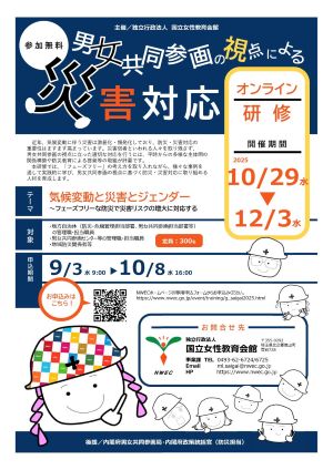 | 詳細: | 『気候変動と災害とジェンダー ~フェーズフリーな防災で災害リスクの増大に対応する』をテーマに、「男女共同参画の視点による災害対応研修」を開催します。 本研修では、「フェーズフリー」の考え方を取り入れながら、講義、事例報告や参加者情報交換会などのプログラムを通じて実践的に学び、男女共同参画の視点に基づく防災・災害対応に取り組める人材を育成します。 ■申込期間 令和7年9月3日(水)~10月8日(水) 申込方法等の詳細は、以下をご覧ください。 https://www.nwec.go.jp/event/training/g_saigai2025.html ■受講期間 令和7年10月29日(水)~12月3日(水) ■方法 オンライン形式(オンデマンド配信、一部ライブ配信) ■対象 地方自治体、男女共同参画センター等の管理職、担当職員及び地域防災の関係者 ■参加費 無料(ただし、通信にかかる費用は参加者負担) ■内容 基調講演、情報提供、講義、事例報告、情報交換会 ■問合せ先 独立行政法人国立女性教育会館事業課 〒355−0292 埼玉県比企郡嵐山町菅谷728 電話 0493-62-6724(平日9:00~17:00) E-mail ml.saigai@nwec.go.jp *お問い合わせは原則としてメールでお願いします。 |