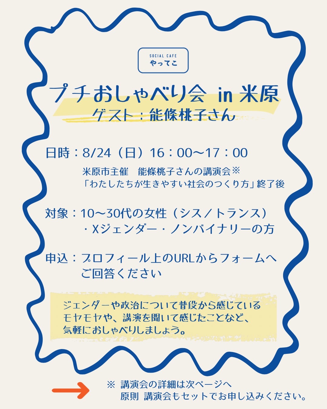 | 詳細: | ※開始時間が16:00→15:50に変更になりました Social Cafe やってこ からイベントのお知らせです! 8/24(日)、滋賀県米原市での能條桃子さん(FIFTYS PROJECT代表)の講演会「 私たちが生きやすい社会のつくり方~若者、女性の政治参画を促進する活動から~ 」終了後、能條さんをゲストにお迎えしたプチおしゃべり会を開きます! (今回はFIFTYS PROJECTの文脈でお呼びするため、おしゃべり会の参加は10〜30代の女性(シス/トランス)•Xジェンダー•ノンバイナリーの方に限定させていただきます。) ジェンダーや政治について普段から感じているモヤモヤや、講演を聞いて感じたことなど、気軽におしゃべりしましょう。 【日時】8/24(日) 15:50~16:50 米原市主催の講演会終了後 ※原則講演会もセットでお申し込みください。 【対象】10〜30代の女性(シス/トランス)•Xジェンダー•ノンバイナリーの方 【定員】10名 【申込】https://forms.gle/DQVYEUhyuKBpe91K8 〇米原市主催の講演会「 私たちが生きやすい社会のつくり方~若者、女性の政治参画を促進する活動から~ 」について こちらは年齢•性別を問わずどなたでも参加可能です。能條さんは若者や女性の政治参画について楽しくわかりやすくお話ししてくれる方です!既に問題意識を持っている方はもちろんのこと、「若者の政治参画は必要だと思うけれど、性別に着目するのはピンとこない」「若者・女性の政治家が少ないことは知っているけれど、それが自分にどういう影響を与えているのかわからない」という方にもおすすめです。ぜひお気軽に参加してみてください。 詳細はこちら https://www.city.maibara.lg.jp/shisei/plan/other/jinken/22713.html 〇FIFTYS PROJECTとは 政治分野のジェンダー不平等の解消を目指して、 ジェンダー平等実現を目指して地方議会議員に立候補する 20代・30代の女性(トランス女性を含む)やノンバイナリー、 Xジェンダー等の方を増やし、横に繋ぎ、一緒に支援するムーブメントです。 〇Social Cafe やってこ とは FIFTYS PROJECTが、地域からジェンダー平等実現に取り組む人を応援するために実施する「オーガナイザー育成講座」の、受講生2人が立ち上げたグループ。滋賀を拠点に活動しています。 |