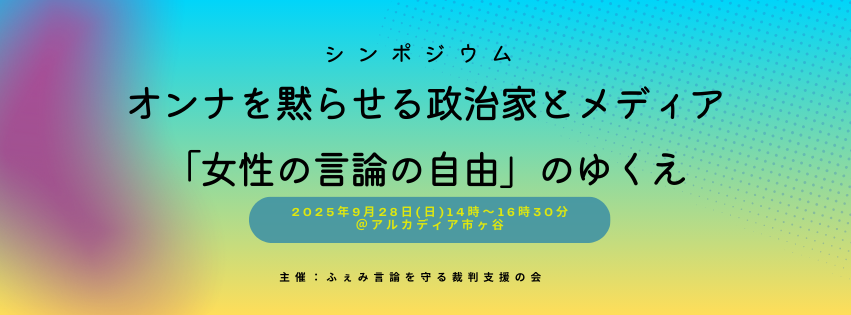| 詳細: | 【シンポジウム】オンナを黙らせる政治家とメディア〜「女性の言論の自由」のゆくえ 政治家やメディアによる女性の言論抑圧が繰り返される今、朝日新聞・三浦まり側の名誉毀損裁判勝訴の裁判報告と共に「女性の言論の自由」の現状と課題を多角的に議論します。 報道・SNS・司法の現場から見える構造を共有し、私たちが声をあげ続けるために何ができるのかを考えるシンポジウムを下記の通り企画しましたのでぜひご参加ください。 日時:2025年9月28日(日)14時〜16時半 場所:アルカディア市ヶ谷 私学会館 参加費:500円(要申込) 総合司会:林香里(東京大学大学院情報学環教授) ※オンライン配信はございません 第1部 ふぇみ言論を守る裁判〜勝訴報告会 猪瀬直樹氏が三浦まりと朝日新聞を名誉毀損で提訴してから約3年。朝日・三浦側の高裁での勝訴が確定したことを記念し、裁判の報告及び支える会の報告を行います。 三浦まり(上智大学法学部教授)、西川有理子(事務局) 第2部 共同モデレーター:林香里、三浦まり 三浦まり:趣旨説明、政治家という加害者 中野麻美(弁護士):性暴力と報道の自由の侵害 浜田敬子(ジャーナリスト):大手メディアにおける「有識者」の役割、デジタル化の影響 田中東子(東京大学大学院情報学環教授):SNS:アテンション・エコノミーと匿名性の空間に拡がるミソジニー 林香里:自主規制の限界:メディア業界のジェンダーギャップ、機能しないBPO リレートーク 元橋利恵(津田塾大学 学芸学部国際関係学科 専任講師) フェミ科研裁判(国会議員による科研費介入. とフェミニズムバッシングを許さない裁判)を支援して 松元ちえ(ジャーナリスト)記者への公権力による性暴力裁判(長崎/埼玉) 申込はこちら https://docs.google.com/forms/d/1jMQiWBEwMfymeRj_QwQPkrrhxbtx-_HZ_8k1MJ0-swc/preview ふぇみ言論を守る裁判支援の会事務局 西川有理子 |