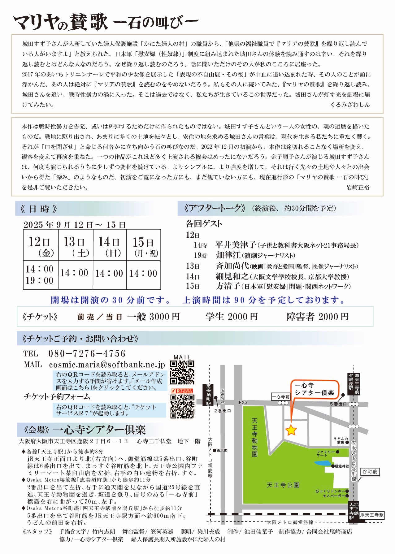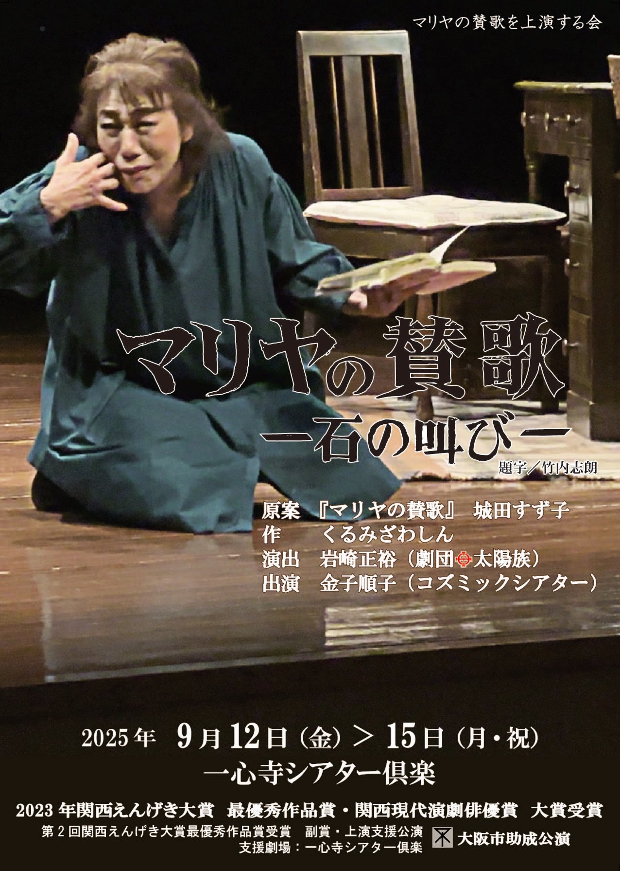 | 詳細: | 「マリヤの賛歌ー石の叫び」は、城田すず子さんという、日本で慰安婦だった過去を告白した数少ない日本人の1人が残した自伝「マリヤの賛歌」を元に、精神科医であり作家のくるみざわしんが戯曲化した作品です。2022年の初演を皮切りに、翌年には東大阪での半年間ロングラン公演を敢行、これを機に神奈川、千葉、埼玉、和歌山と各地からお呼びいただき、そして来月は9月12日から4日間、大阪天王寺にて上演いたします。 あいちトリエンナーレ2019の「表現の不自由展」における平和の少女像の展示が相応しくないと開催が中止に追い込まれたことを受け、くるみざわは今まで慰安婦問題に作品を通して関わってこなかったということに気づき、また、作品を作り上演することで反対の声をあげようと決意し執筆にとりかかりました。 毎回公演終了後はアフタートークを実施しておりますが、今回も5名の方々にお越しいただきます。 ・子どもと大阪教科書ネット21事務局長の平井美津子さん ・元毎日新聞記者で現・演劇ジャーナリストの畑律江さん ・映画『教育と愛国』監督、映像ジャーナリストの斉加尚代さん ・大阪文学学校校長、京都大学教授の細見和之さん ・日本軍「慰安婦」問題・関西ネットワークの方清子さん くるみざわとの約30分のアフタートークはいつもながらに濃い内容です。 また、出演の金子順子(コズミックシアター)は関西でも指折りの俳優で、この作品においても関西現代演劇俳優賞大賞を受賞をしております。作品自体も、関西えんげき大賞・最優秀作品賞を受賞いたしました。演出の岩崎正裕(劇団太陽族)は金子の良き伴走者となり、金子の良さを最大限に引き出しながらも会場が変わる度に変化をつけ、作品中に登場する「私」とお客様がリンクするような、そんな仕掛けを作り出したりと、毎回少しずつ色を変えています。 たくさんの方々にご覧いただきたい作品です。是非、ご観劇にお越しください。心よりお待ち申し上げます。 |