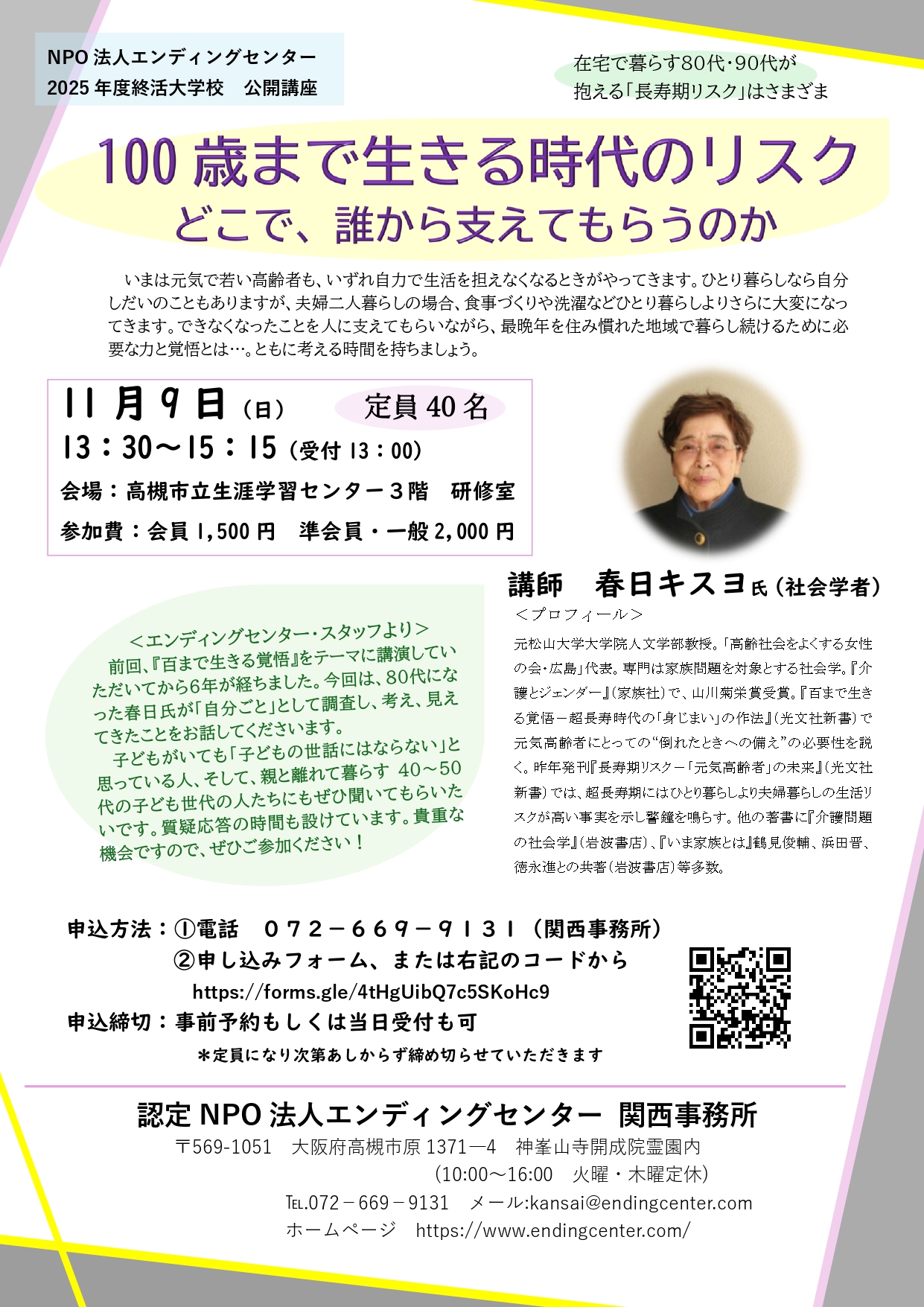 | 詳細: | 認定NPO法人エンディングセンター 2025年度終活大学校 公開講座 「100歳まで生きる時代のリスク どこで、誰から支えてもらうのか」 いまは元気で若い高齢者も、いずれ自力で生活を担えなくなるときがやってきます。 ひとり暮らしなら自分しだいのこともありますが、夫婦二人暮らしの場合、食事づくりや洗濯などひとり暮らしよりさらに大変になってきます。 できなくなったことを人に支えてもらいながら、最晩年を住み慣れた地域で暮らし続けるために必要な力と覚悟とは…。ともに考える時間をもちましょう。 【日 時】 11月9日(日) 13:30~15:15(受付13:00) 【会 場】 高槻市立生涯学習センター3階 研修室 【定 員】 40名 *予約もしくは当日受付も可 定員になり次第締め切ります。 【申込方法】①電話 072-669-9131(10:00~16:00 火曜・木曜除く) ②申込フォーム https://forms.gle/4tHgUibQ7c5SKoHc9 【受講料】 一般2,000円 エンディングセンター会員1,500円 エンディングセンター準会員2,000円 【講 師】 春日キスヨさん(社会学者) 元松山大学大学院人文学部教授。「高齢社会をよくする女性の会・広島」代表。専門は家族問題を対象とする社会学。 『介護とジェンダー』(家族社)で、山川菊栄賞受賞。 『百まで生きる覚悟-超長寿時代の「身じまい」の作法』(光文社新書)で元気高齢者にとっての“倒れたときへの備え”の必要性を説く。 昨年刊行された『長寿期リスク-「元気高齢者」の未来』(光文社新書)では、超長寿期にはひとり暮らしより夫婦暮らしの生活リスクが高い事実を示し警鐘を鳴らす。 |