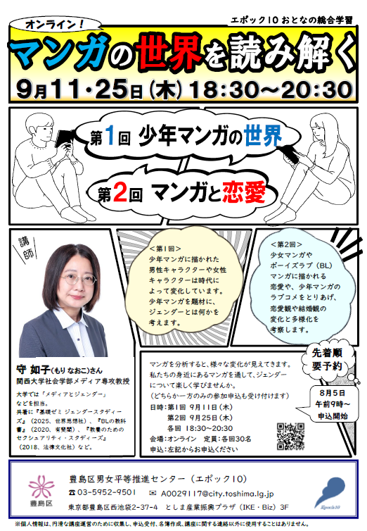 | 詳細: | オンライン「マンガの世界を読み解く」 9月25日(木曜日)午後6時半~8時半 第2回:マンガと恋愛(少女マンガやボーイズラブ<BL>マンガに描かれる恋愛や、少年マンガのラブコメをとりあげ、恋愛観や結婚観の変化と多様化を考察します) マンガを分析すると、様々な社会の変化が見えてきます。私たちの身近にあるマンガを通して、ジェンダーについて楽しく学びます。 申込や詳細はイベントURLをご確認ください。 |