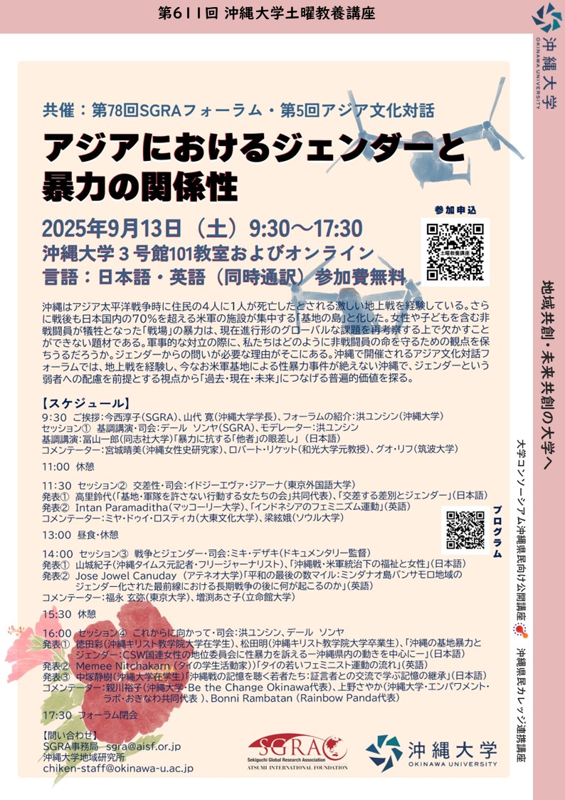 | 詳細: | 第78回SGRAフォーラム「アジアにおけるジェンダーと暴力の関係性」へのお誘い 下記の通り第78回SGRAフォーラム ・第5回アジア文化対話・第611回沖縄大学土曜教養講座・第5回アジア文化対話(Asian Cultural Dialogues)「アジアにおけるジェンダーと暴力の関係性」を対面とオンラインのハイブリットで開催いたします。参加ご希望の方は、事前に参加登録をお願いします。 テーマ:「アジアにおけるジェンダーと暴力の関係性」 日 時:2025年9月13日(土)9:30~17:30 会 場:沖縄大学3号館101教室 およびオンライン(Zoomウェビナー) 言 語:日本語・英語(同時通訳) 参 加:無料/こちらから。 共同主催:渥美国際交流財団関口グローバル研究会・沖縄大学地域研究所 ※会場参加の方もオンライン参加の方も必ず参加登録をお願いします。 お問い合わせ:SGRA事務局(sgra@aisf.or.jp) ◇フォーラムの趣旨 沖縄はアジア太平洋戦争時に住民の4人に1人が死亡したとされる激しい地上戦を経験している。さらに戦後も日本国内の70%を超える米軍の施設が集中する「基地の島」と化した。女性や子どもを含む非戦闘員が犠牲となった「戦場」の暴力は、現在進行形のグローバルな課題を再考察する上で欠かすことができない題材である。軍事的な対立の際に、私たちはどのように非戦闘員の命を守るための観点を保ちうるだろうか。ジェンダーからの問いが必要な理由がそこにある。 沖縄で開催されるAsian Cultural Dialogues(ACD;アジア文化対話)フォーラムでは、地上戦を経験し、今なお米軍基地による性暴力事件が絶えない沖縄で、ジェンダーという弱者への配慮を前提とする視点から「過去・現在・未来」につなげる普遍的価値を探る。本フォーラムは「沖縄の問題」を論じるものではない。多国籍の専門家により構成され、その議論の焦点は沖縄という空間で出会う「アジア的視点」と言える。2025年度は戦後80周年という節目の年であり、いかにアジア太平洋戦争時の傷痕に向き合うかをアジア各地で議論する年でもある。議論の場である沖縄はもちろん、アジアの過去、現在、未来に一貫して忘れてはならない本質的な価値とは何かを国際的かつ学際的に、さらにはアカデミアを超えて皆で考える機会になることを望んでいる。 ◇プログラム 9:30 イベント開始 ご挨拶 今西淳子(SGRA)、山代 寛(沖縄大学学長) フォーラムの紹介 洪 玧伸(沖縄大学) セッション① 基調講演 司会:デール ソンヤ(SGRA)、モデレーター:洪 玧伸 基調講演:冨山一郎(同志社大学)「暴力に抗する「他者」の眼差し」 45分(日本語) コメンテーター:宮城晴美(沖縄女性史研究家)、ロバート・リケット(和光大学元教授)、グオ・リフ(筑波大学) 11:00 休憩 11:30 セッション② 交差性・各発表:30分 司会:イドジーエヴァ・ジアーナ(東京外国語大学) 発表1 高里鈴代(「基地・軍隊を許さない行動する女たちの会」共同代表)「交差する差別とジェンダー」(日本語) 発表2 Intan Paramaditha(マッコーリー大学)、「インドネシアのフェミニズム運動」(英語) コメンテーター:ミヤ・ドゥイ・ロスティカ(大東文化大学)、梁絃娥(ソウル大学) 13:00 昼食・休憩 14:00 セッション③ 戦争とジェンダー・各発表:30分 司会:ミキ・デザキ(ドキュメンタリー監督) 発表1 山城紀子(沖縄タイムス元記者・フリージャーナリスト)「沖縄戦・米軍統治下の福祉と女性」(日本語) 発表2 Jose Jowel Canuday(アテネオ大学)「平和の最後の数マイル:ミンダナオ島バンサモロ地域のジェンダー化された最前線における長期戦争の後に何が起こるのか」(英語) コメンテーター:福永 玄弥(東京大学)、増渕あさ子(立命館大学) 15:30 休憩 16:00 セッション④ これからに向かって・各発表:20分 司会:洪 玧伸、デール ソンヤ 発表1 徳田彩(沖縄キリスト教学院大学在学生)、松田明(沖縄キリスト教学院大学卒業生) 「沖縄の基地暴力とジェンダー:CSW国連女性の地位委員会に性暴力を訴えるー沖縄県内の動きを中心にー」(日本語) 発表2 Memee Nitchakarn (タイの学生活動家))「タイの若いフェミニスト運動の流れ」(英語) 発表3 中塚静樹(沖縄大学在学生)「沖縄戦の記憶を聴く若者たち:証言者との交流で学ぶ記憶の継承」(日本語) コメンテーター:親川裕子(沖縄大学・Be the Change Okinawa代表)、上野さやか(沖縄大学・エンパワメント・ラボ・おきなわ共同代表 )、Bonni Rambatan (Rainbow Panda代表) 17:30 フォーラム閉会 |