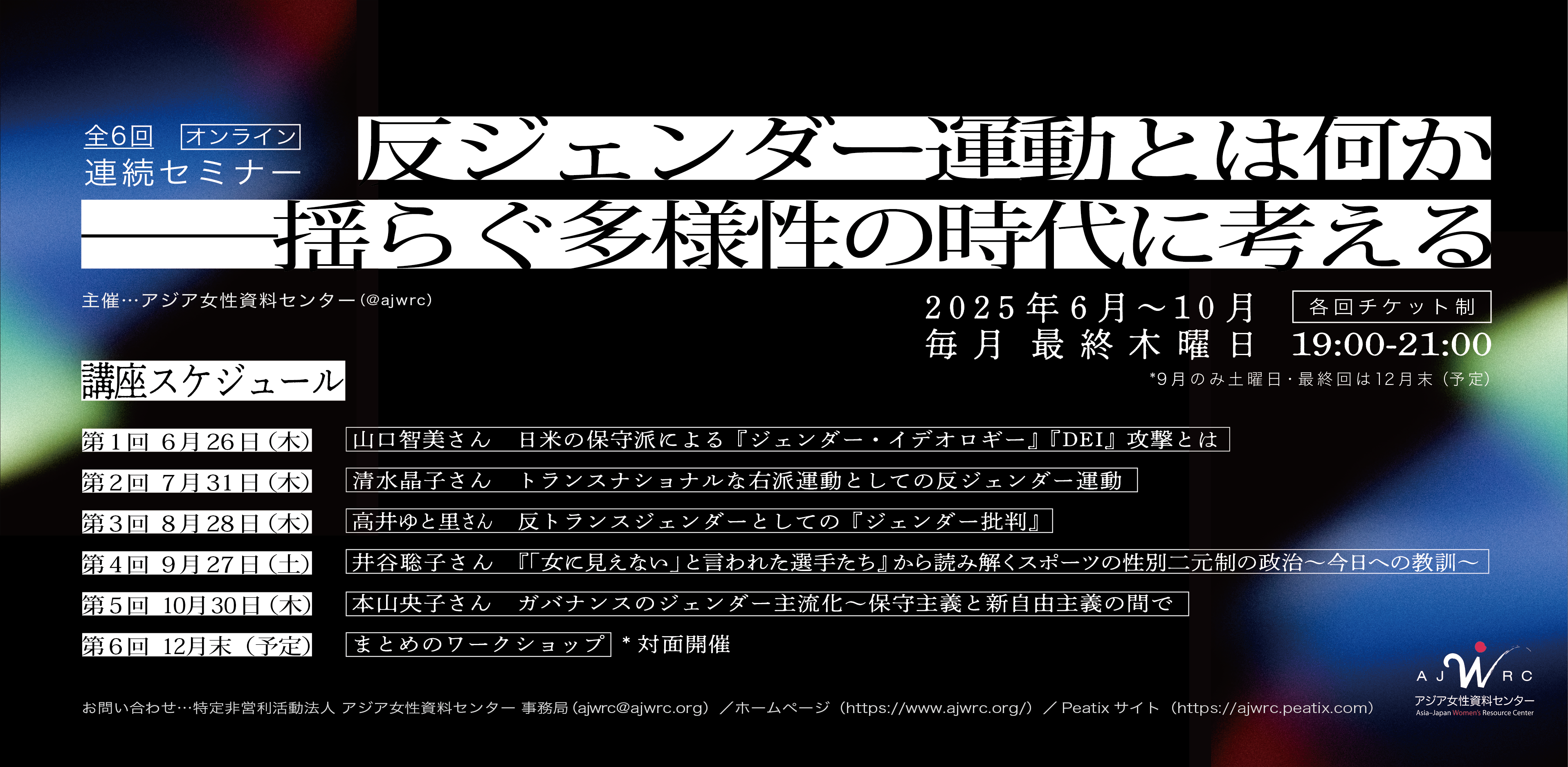 | 詳細: | 【反ジェンダー運動とは何か──揺らぐ多様性の時代に考える 第4回】 高井ゆと里さん「反トランスジェンダーとしての『ジェンダー批判』」 ◆内容 あらゆる制度・文化がジェンダー化された社会における構造的な性差別を捉えるには、ジェンダーの視点が欠かせない。しかし昨今、そうした蓄積に負うはずの一部のジェンダー/フェミニズム研究者が、ジェンダー概念の妥当性を否定するなどしている。その動機は「女性の安全」を名目としたトランスジェンダー排除だが、その帰結はあまりに自己破壊的である。今講演では、そうした動きにも注目しつつ、反トランスジェンダーとしての反ジェンダー運動について概観する。 ◆講師プロフィール 高井ゆと里さん 群馬大学准教授。倫理学者。共著に『トランスジェンダー入門』、『トランスジェンダーQ&A』、編著に『トランスジェンダーと性別変更』、翻訳にショーン・フェイ『トランスジェンダー問題』など。 ━━━━━━━━━━━━━━━━━━━━━━━━━━━━━━━━━━ 【日時】8月28日(木)19:00〜21:00 ※オンライン開催 ※アーカイブ配信あり ※同時字幕付き 【申し込み・詳細】https://ajwrcseminar2025-3.peatix.com ※今からでも全回を受講できる!通し券のご購入はこちらから→ https://ajwrcseminar2025-12345.peatix.com ━━━━━━━━━━━━━━━━━ ◆開催概要 【開催方式】オンライン(Zoom) ※録画配信あり(視聴期限:次回講座の開始時間まで、約1ヶ月間) 【参加費・1回分】1,500円(一般)、1,000円(学生・経済的事情のある方) 【参加費・全回通し券】¥7500(一般)、¥5000(学生・経済的事情のある方) 【情報保障】同時字幕(UDトーク、校正あり) 【チケット販売締切】講座が始まる1時間前(当日18:00)まで ━━━━━━━━━━━━━━━━━ ◆「反ジェンダー運動とは何か──揺らぐ多様性の時代に考える」(全6回)の趣旨・内容 「ジェンダーはイデオロギー」「男女という2つの生物学的性別しか存在しない」として、DEI(多様性・公平性・包摂)推進を逆転させる「反ジェンダー運動」と呼ばれる動きが、アメリカをはじめ世界各地で台頭しています。さらにフェミニズムの中からさえ、性別は社会によってつくられるものではなく生まれつき決まっているという保守的考え方が台頭しつつあります。 しかし「ジェンダー」は、机上の空論ではありません。それは、あたかも不変の自然であるかのように本質化されてきた男女の差異、そして同じように本質化されてきたセクシュアリティ・人種・民族・国籍・障害などが交差する権力関係を読み解き挑戦するために、フェミニズム運動が現実と格闘しながら議論し鍛え上げてきた概念です。 この連続セミナーでは、「反ジェンダー運動」の台頭を批判的に検証するとともに、フェミニズムやクィアの運動にとって「ジェンダー」概念を獲得し鍛え上げることがなぜ重要かを再考し、困難さを増す政治的状況のなかで、現実に生きる人々への影響や、対抗策を考えていきます。 ━━━━━━━━━━━━━━━━━ ◆日程・各回テーマ 【第1回/終了】6月26日(木)19:00~21:00 山口智美さん「日米の保守派による『ジェンダー・イデオロギー』『DEI』攻撃とは」(アーカイブ視聴申込可能) https://ajwrcseminar2025-1-archive.peatix.com/view 【第2回/終了】7月31日(木)19:00~21:00 清水晶子さん「トランスナショナルな右派運動としての反ジェンダー運動」 https://ajwrcseminar2025-2.peatix.com/ 【第3回】8月28日(木)19:00~21:00 高井ゆと里さん「反トランスジェンダーとしての『ジェンダー批判』」 https://ajwrcseminar2025-3.peatix.com/ 【第4回】9月27(土) 19:00~21:00 井谷聡子さん「『「女に見えない」と言われた選手たち』から読み解くスポーツの性別二元制の政治〜今日への教訓〜」 https://ajwrcseminar2025-4.peatix.com/ 【第5回】10月30日(木)19:00~21:00 本山央子さん「ガバナンスのジェンダー主流化~保守主義と新自由主義の間で」 https://ajwrcseminar2025-5.peatix.com/ ※上記の回はすべてオンラインにて開催します。事後アーカイブ配信あり。 ※同時字幕付き 【第6回】 まとめのワークショップ【対面/東京23区内】 12月13日午後(詳細未定) ※1回以上セミナーに参加された方限定 ※別途チケット購入が必要ですのでご注意ください。 |