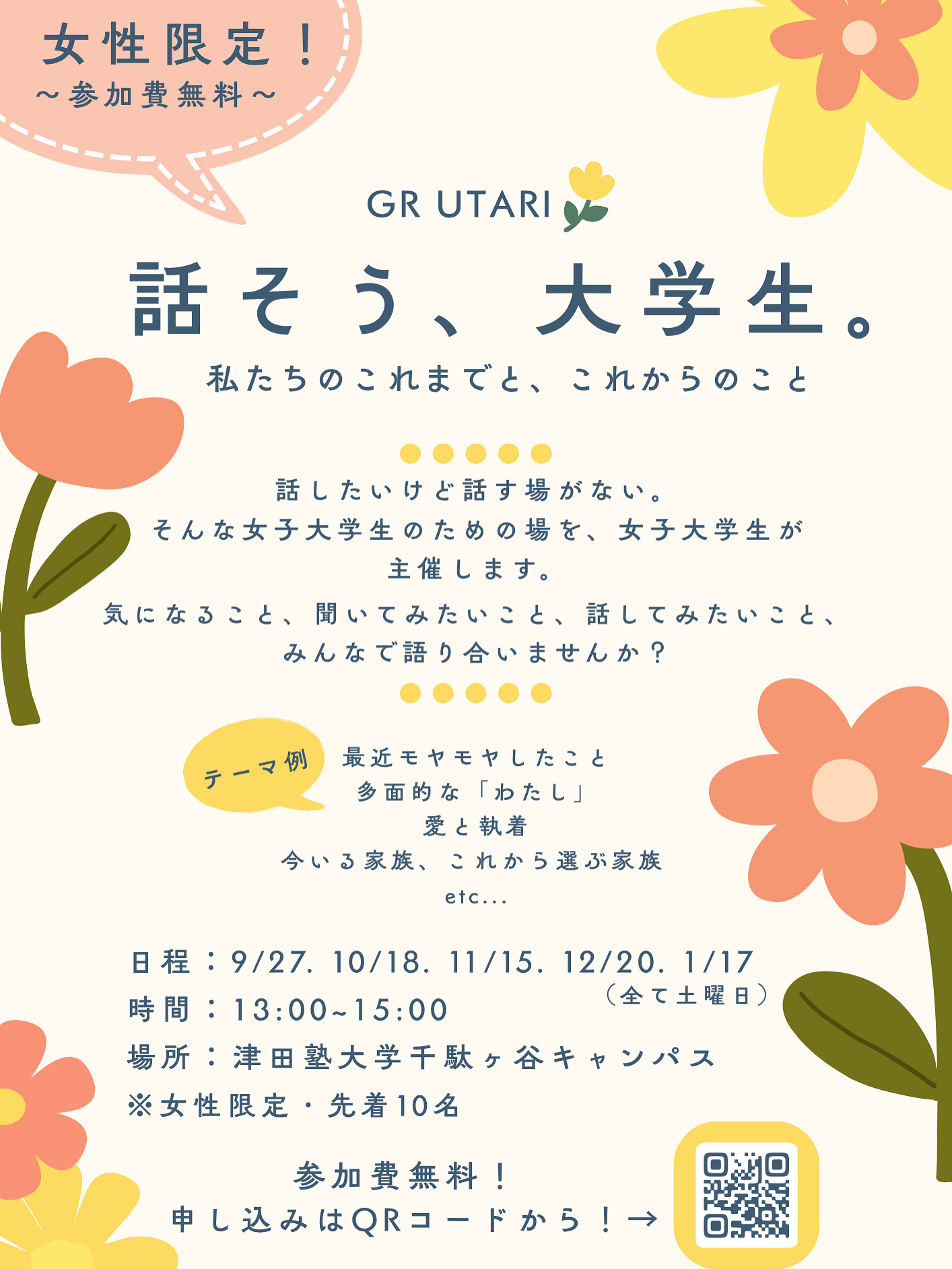 | 詳細: | 「話したいけど、話す場所がない…」そんなあなたへ 同じ立場の女子大学生同士で、これまでのこと、これからのこと、語り合いませんか? ◯ テーマ例 ・最近モヤモヤしたこと ・多面的な「わたし」 ・愛と執着 ・今いる家族、これから選ぶ家族…などなど! ◯ 日程 9/27, 10/18, 11/15, 12/20, 1/17(すべて土曜日) 時間:13:00〜15:00 場所:津田塾大学 千駄ヶ谷キャンパス 対象:女子大学生限定・先着10名 参加費:無料 \あなたの「話したい」を、ここで/ 参加希望の方→(https://docs.google.com/forms/d/e/1FAIpQLSc1Qzs-CKwDFqN_ePdGpEXE9Iq5EQ5or95F5eDf7fS1bkrtCA/viewform) |