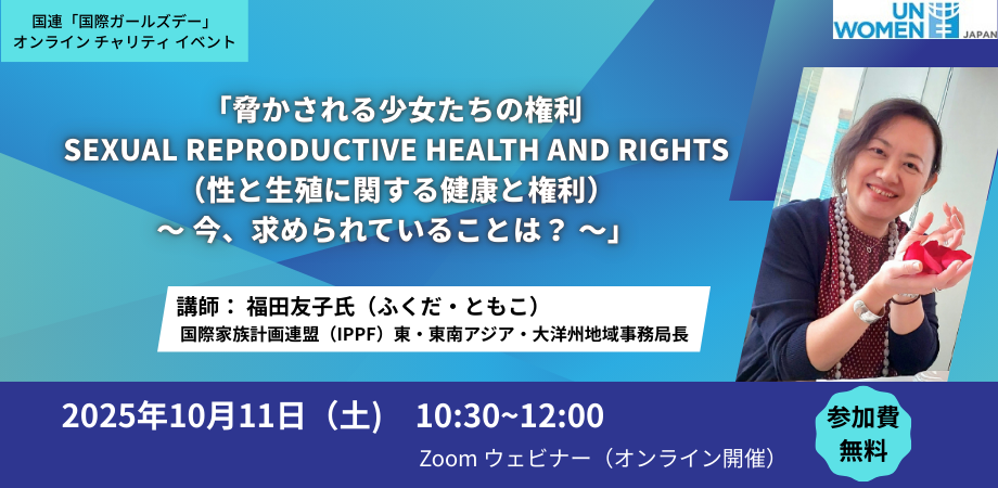 | 詳細: | 国連 「国際ガールズデー」 オンライン チャリティ・イベント 10月11日 (土) 開催のお知らせ(寄付募集) 国連ウィメン日本協会では、「脅かされる少女たちの権利Sexual Reproductive Health and Rights(性と生殖に関する健康と権利)~ 今、求められていることは? ~」と題し、国際家族計画連盟(IPPF)東・東南アジア・大洋州地域事務局長の福田友子氏によるオンライン イベントを2025年10月11日(土)に、参加費無料で開催します。ぜひご参加ください。 「脅かされる少女たちの権利 Sexual Reproductive Health and Rights(性と生殖に関する健康と権利) ~ 今、求められていることは? ~」 ―2025年10月11日(土) 午前10時30分から参加費無料にてオンライン開催― 10月11日は、少女のエンパワーメントを目的に国連が制定した「国際ガールズデー」です。少女たちの権利を守り、ジェンダー平等で明るい未来を目指すための日です。 6才になれば就学し、さまざまなことを外界から吸収することができる...私たちが当たり前だと思うことが、残念ながら非常に難しい国や地域がまだたくさんあります。好きな人、自分が選んだ人と結婚するかしないか。子どもを産むか産まないか、産むとしたらいつ何人産むか。人生を大きく左右する決断を自らおこなうことができない女性や少女が数多くいます。 今回のオンラインセミナーでは、セクシュアル・リプロダクティブ・ヘルス/ライツ(性と生殖に関する健康と権利)といわれる権利が、特にアジア大洋州地域でいかに少女たちから奪われているのかという現状に加え、今どのような対策が必要とされているのかについて考えます。 <イベントプログラム 概要> タイトル : 「脅かされる少女たちの権利 Sexual Reproductive Health and Rights(性と生殖に関する健康と権利) ~ 今、求められていることは? ~」 講 師 : 福田友子氏 国際家族計画連盟(IPPF)東・東南アジア・大洋州地域事務局長 開 催 日 : 2025年10月11日(土) 10:30 ~ 12:00 開催形式 : Zoom ウェビナーによるオンライン開催 参 加 費 : 無料 (チケットの申し込みと合わせてご寄付いただけます) 申込 〆切 : 10月10日(金)20時まで 申込 方法 : 下のボタンからお申し込みください 申し込む ※上記以外に国連ウィメン日本協会事務局へのメールでのお申し込みも可能です。 Email : unwomennihon@adagio.ocn.ne.jp 【 登壇者 : 福田友子氏 プロフィール 】 国際家族計画連盟(IPPF) 東・東南アジア・大洋州地域事務局長 IPPF 東・東南アジア・大洋州地域事務局(ESEAOR)、兼南アジア地域(SARO)の地域事務局長として、域内32カ国の加盟協会を支援する活動をマレーシア・クアラルンプールから率いています。IPPFに着任する前は公益財団法人ジョイセフのアドボカシーマネージャーとして国際保健、SRHRやジェンダーの平等、ユニバーサル・ヘルス・カバレッジ等について政策提言などをしてきたほか、「SDGs市民社会ネットワーク」のジェンダーユニットの幹事団体としての任務も務めました。 ※ IPPF(国際家族計画連盟)は、世界のすべての人々が差別されることなく、自分の健康とセクシュアリティについて自由な選択ができる社会を目指し、性と生殖に関する健康と権利(セクシュアル・リプロダクティブ・ヘルス/ライツ: SRHR)の情報とサービスを提供しています。 主 催 : 認定NPO法人 国連ウィメン日本協会 共 催 : 公益財団法人 日本女性学習財団 開催協力 : 国連ウィメン日本協会大阪、国連ウィメン日本協会北九州、国連ウィメン日本協会多摩国連ウィメン日本協会東京、国連ウィメン日本協会さくら |