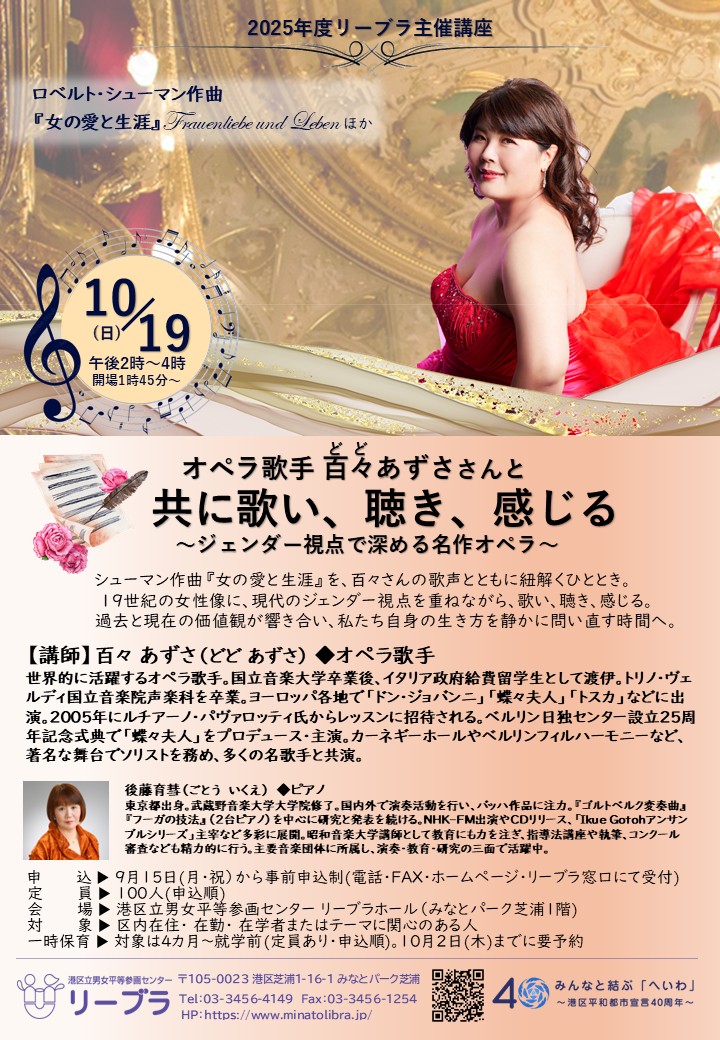 | 詳細: | リーブラでひらく、オペラとジェンダーの扉 「オペラ歌手 百々あずさ(どど あずさ)さん と、 共に歌い、聴き、感じる ~ジェンダー視点で深める名作オペラ~」 シューマン作曲『女の愛と生涯』を、百々さんの歌声とともに紐解くひととき 19世紀の女性像に、現代のジェンダー視点を重ねながら、歌い、聴き、感じる 過去と現在の価値観が響き合い、私たち自身の生き方を静かに問い直す時間へ 【講師】百々あずさ(どど あずさ) さん オペラ歌手 世界的に活躍するオペラ歌手。国立音楽大学卒業後、イタリア政府給費留学生として渡伊。トリノ・ヴェルディ国立音楽院声楽科を卒業。ヨーロッパ各地で「ドン・ジョバンニ」「蝶々夫人」「トスカ」などに出演。2005年にルチアーノ・パヴァロッティ氏からレッスンに招待される。ベルリン日独センター設立25周年記念式典で「蝶々夫人」をプロデュース・主演。カーネギーホールやベルリンフィルハーモニーなど、著名な舞台でソリストを務め、多くの名歌手と共演。 お申込み https://www.minatolibra.jp/events/course20251019/ 開 催 日:2025年10月19日(日)午後2時~4時 (開場:午後1時45分~) 申 込 :受付中 電話・FAX・ホームページ・リーブラ窓口にて 定員に達し次第、申し込み受付終了 会 場 :港区立男女平等参画センター リーブラホール 対 象 :区内在住・在勤・在学者またはテーマに関心のある人 定 員 :100人 参 加 費 無料 保 育 対象は4カ月~未就学児(定員あり・申込順) 10月2日(木)までに要予約 |